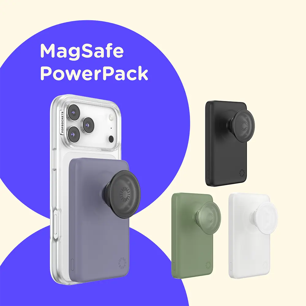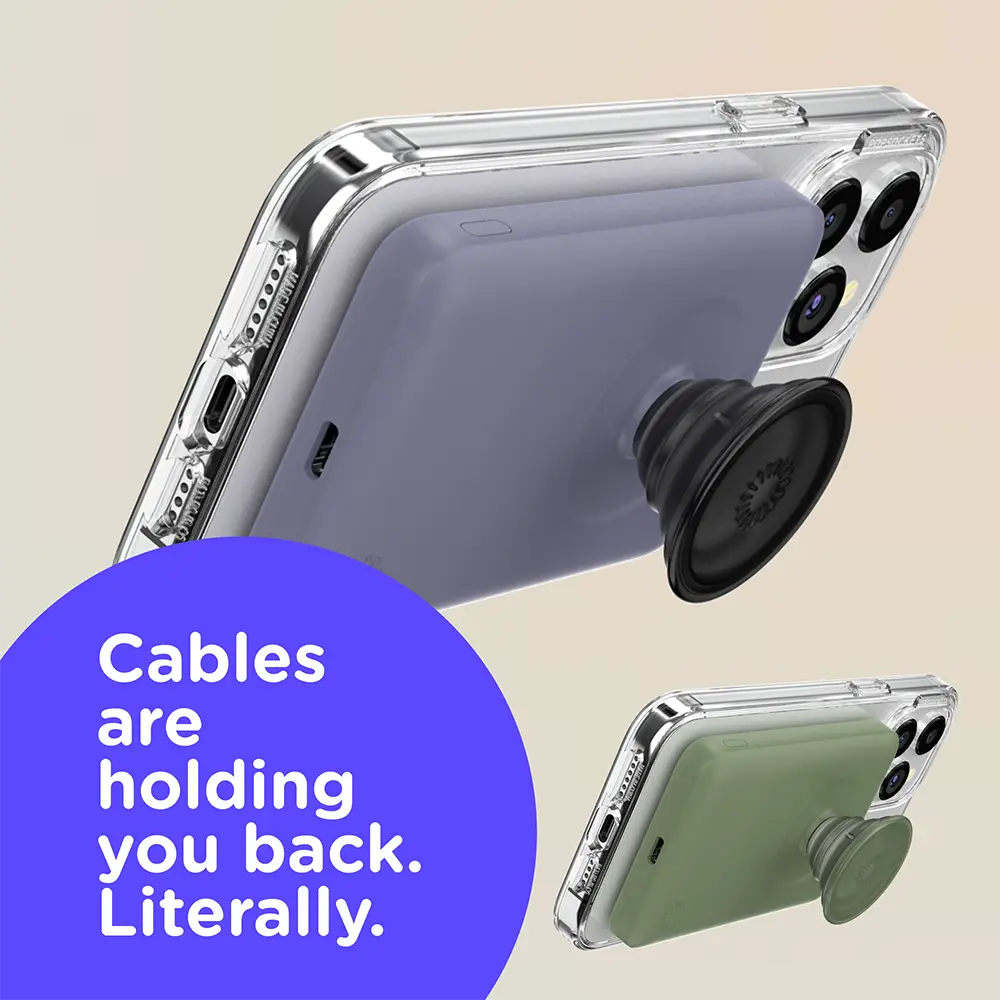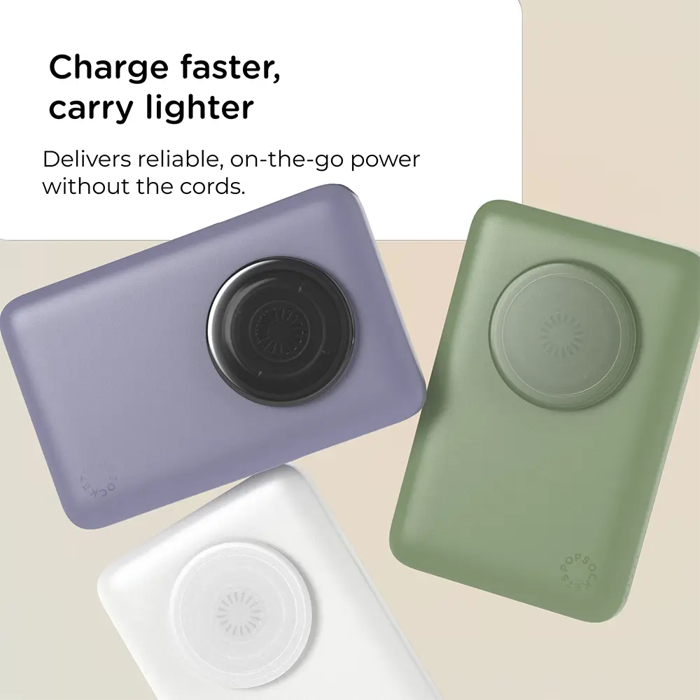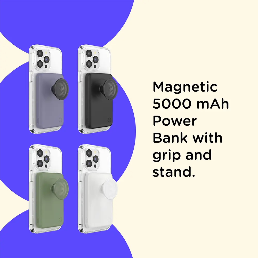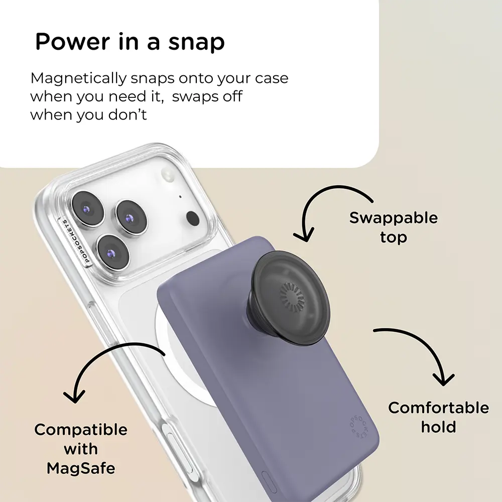 Ditch the wires with our MagSafe PowerPack. This 5000 mAh power bank magnetically snaps to your MagSafe phone or case, ensuring you can charge anytime, anywhere. The integrated PopSockets grip and stand offer comfort, security, and convenience. It supports up to 1x full charge and is optimized for portability.