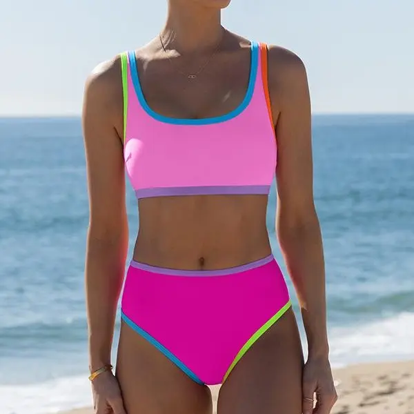 5. Popvil Color Contrast Lace Up Mid Waist Bikinis Set,Tummy Control Neon Sporty Swimsuit for Women with Wide Straps,dealsforyoudays