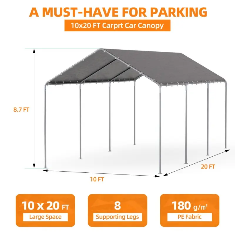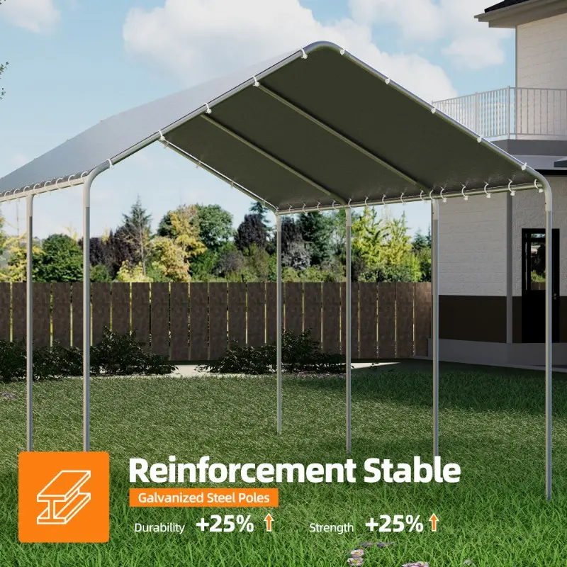 Built with 8 reinforced galvanized steel poles (1.4" diameter, 0.35" thickness), this 10x20 soft-top carport delivers exceptional strength and stability. The rust-resistant metal frame is engineered to withstand harsh outdoor conditions, providing reliable protection for vehicles, boats, and equipment.