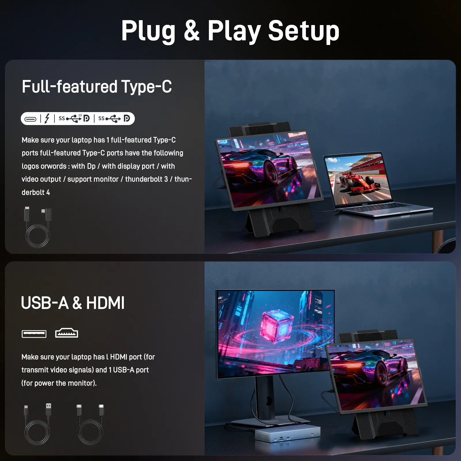 If your laptop has a fully functional Type-C port, (thunderbolt 3.0/4.0, with DP, supporting display, with video output) or HDMI and USB-A ports. You can connect the monitor portatil with Type-C only or use HDMI and USB-A.**Note: If your laptop runs low on power while using the full-featured Type-C connection, you can connect an external 65W adapter to the full featured Type-C of N2 to charge the laptop.