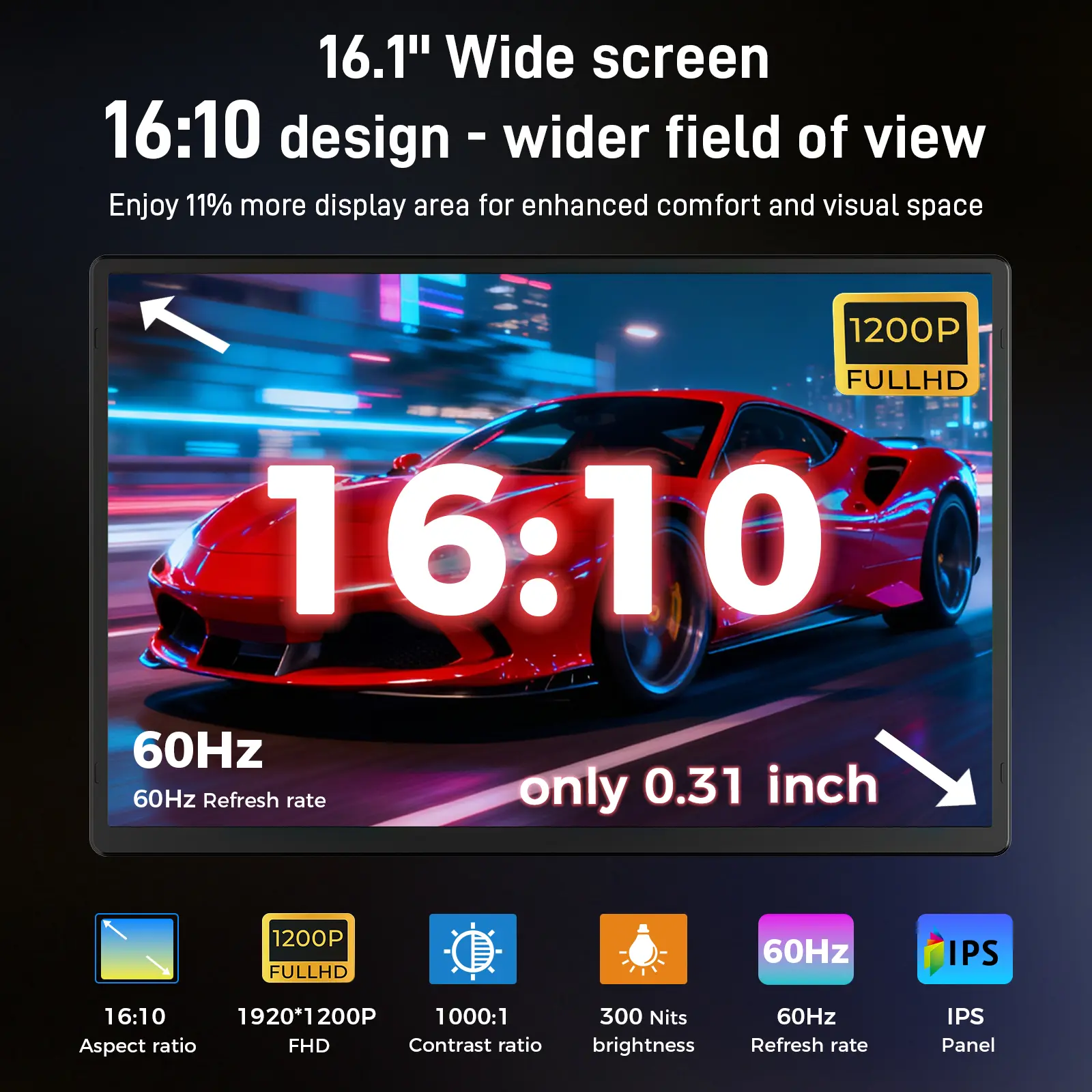Say goodbye to small screens! This 16.1-inch portable monitor offers a delicate 1200P resolution, vivid colors, and a 16:10 golden ratio. It displays more content than a traditional 15.6-inch screen, enhancing efficiency and vision. The IPS panel ensures clear, sharp pictures with consistent color. The ultra-thin design fits easily into a backpack, expanding your screen experience.