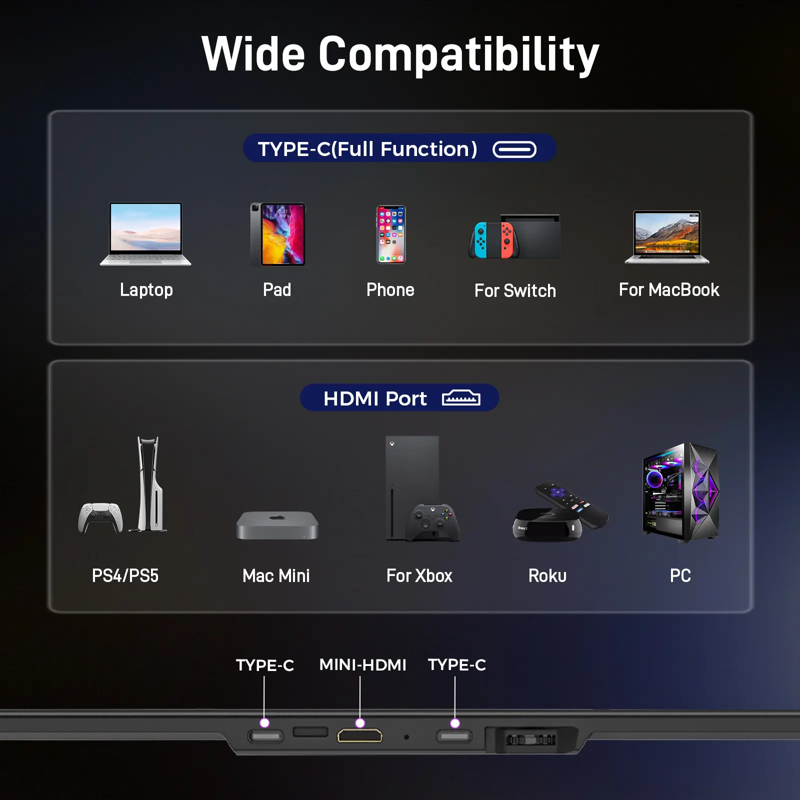 Monitor portable compatible with Mac, PC, windows, android and most other operating systems, if your connection fails the laptop monitor extender, please contact us directly, our after-sales team will provide you with a satisfactory solution within 24 hours! Package includes :1* portable monitor, 1* user manual, 1*portable stand, 1* USB-C to USB-C cable, 1* HDMI to MINI HDMI, 1*USB-A to USB-C cable.