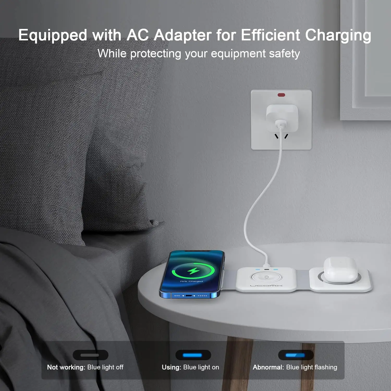 With fast charging speeds—10W for your phone, 5W for earbuds, and 2.5W for your watch—you’ll stay powered up and ready to go. Plus, it supports both horizontal and vertical device placement, so you can charge your phone in the way that suits you best. Crafted from premium materials, this charger is built to last and comes with a supplier warranty for peace of mind.