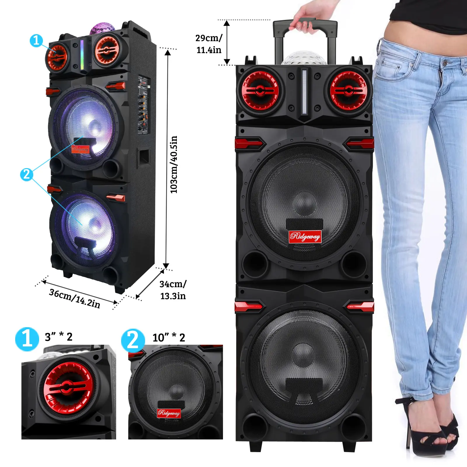 • Speaker Dimensions: 2 x 10" subwoofer and 1 x 3" tweeter