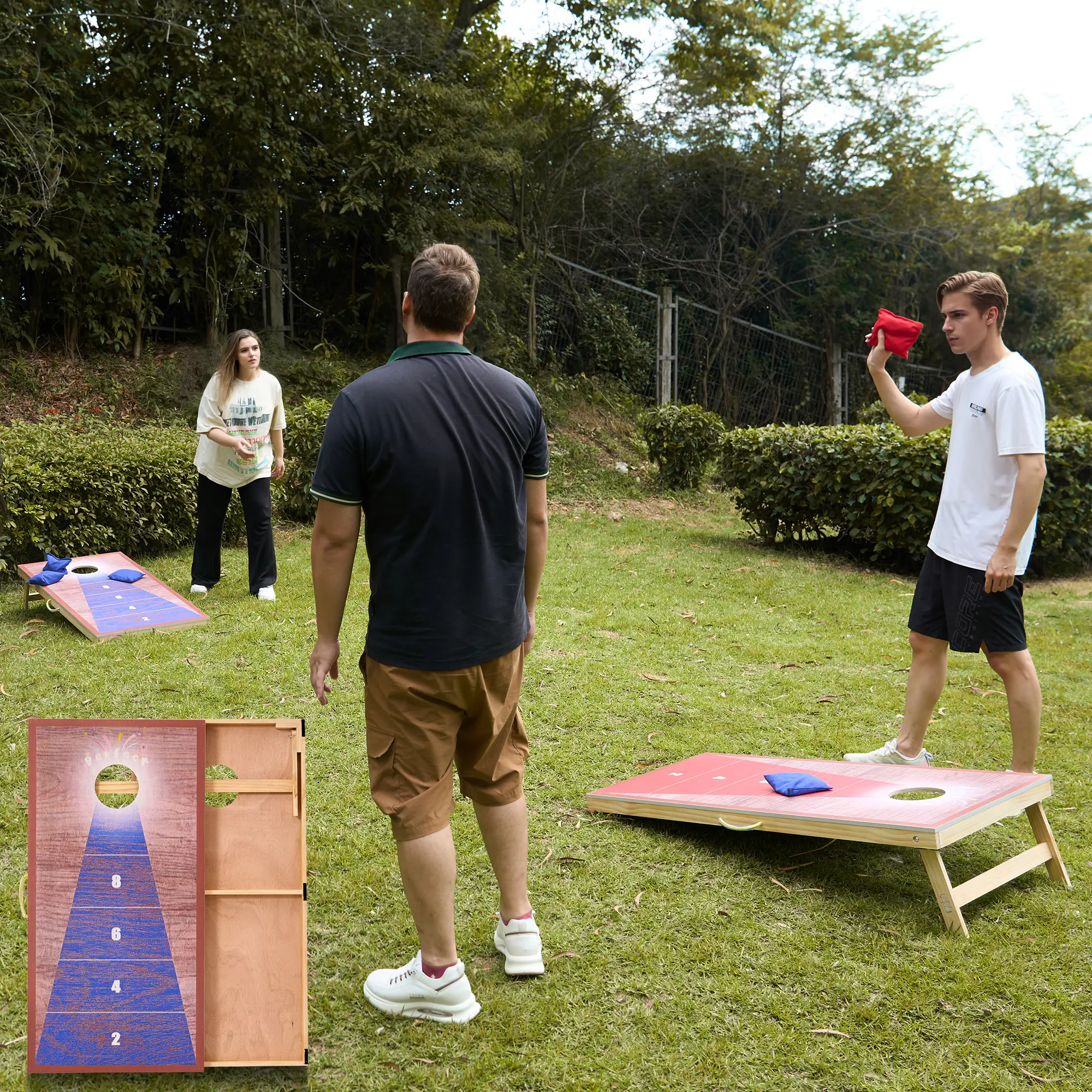 ·This cornhole game set requires no installation. It's ready to use right out of the box, eliminating the hassle of complicated setup procedures and allowing you to dive into the cornhole boards game more quickly. Whether it's an impromptu gathering or a spur-of-the-moment idea, the cornhole set can be set up in no time, so you can enjoy the fun of the game.
