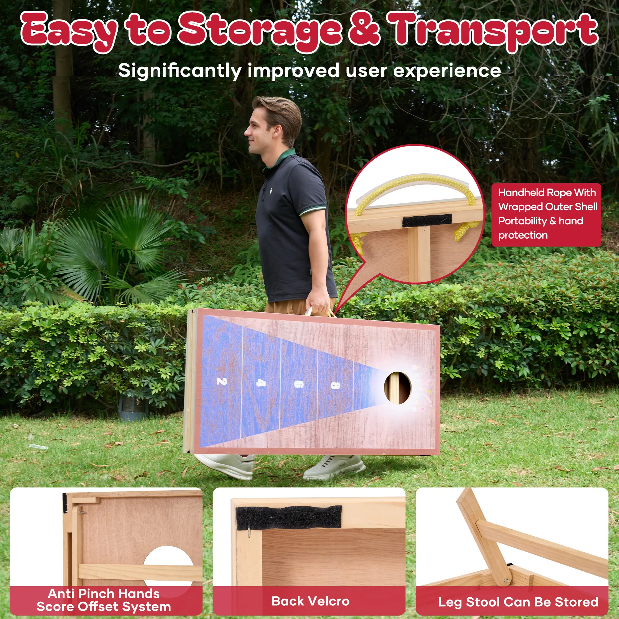 ·The back panel of the cornhole boards is fixed with Velcro, and the design of the hand-carrying rope makes it more convenient to carry. Whether it's an outdoor picnic or a beach party, the cornhole set can be carried easily, allowing you to enjoy the fun of the game anytime and anywhere.