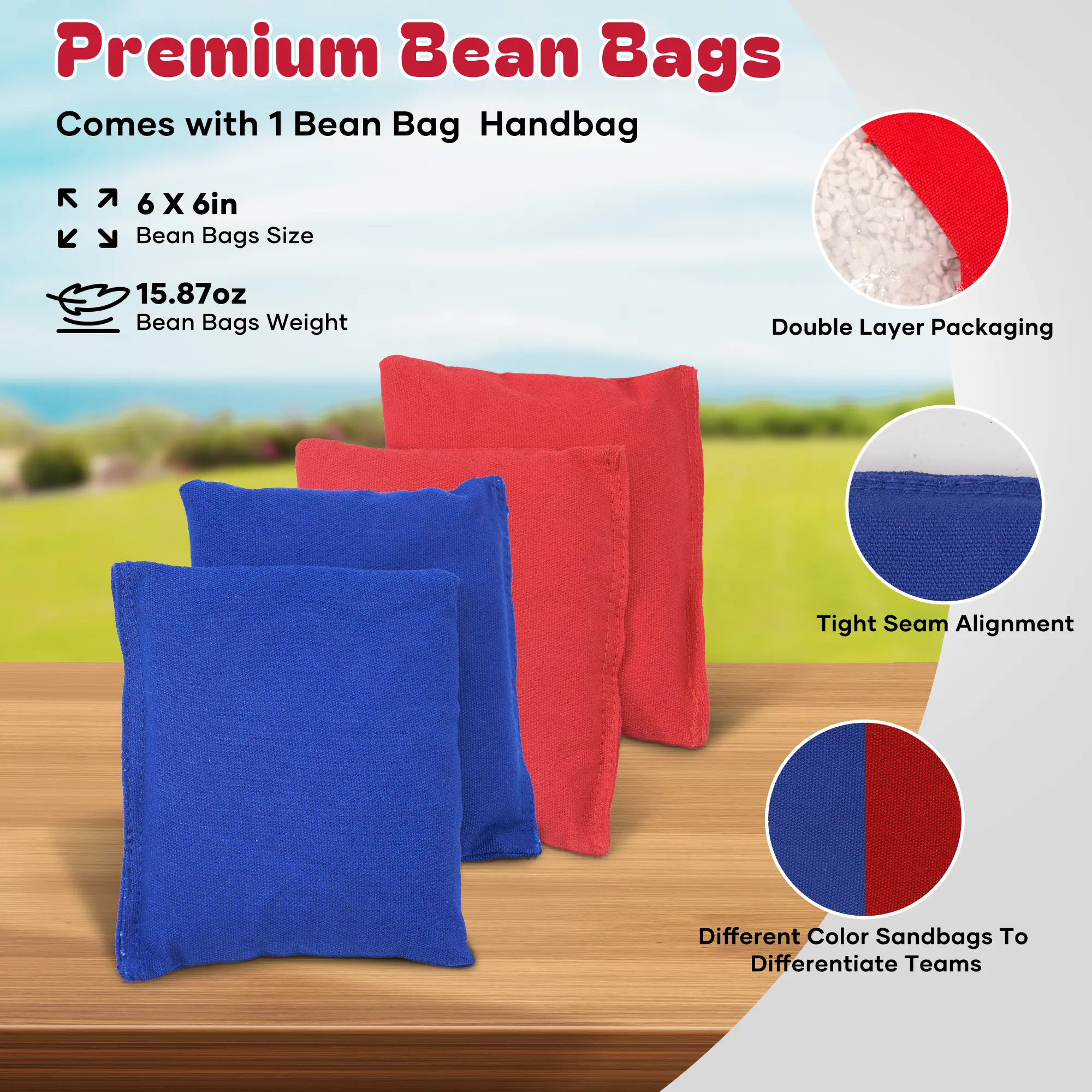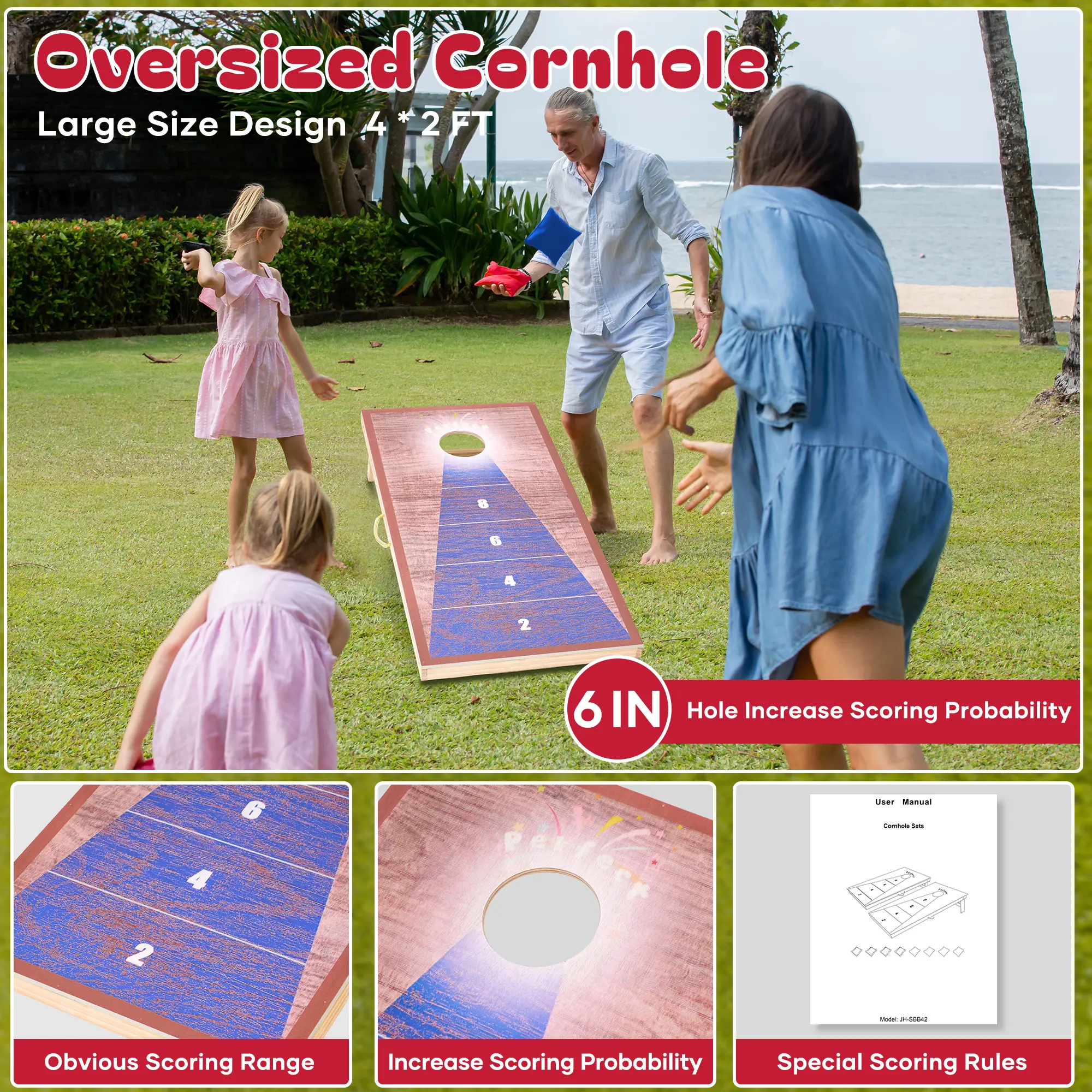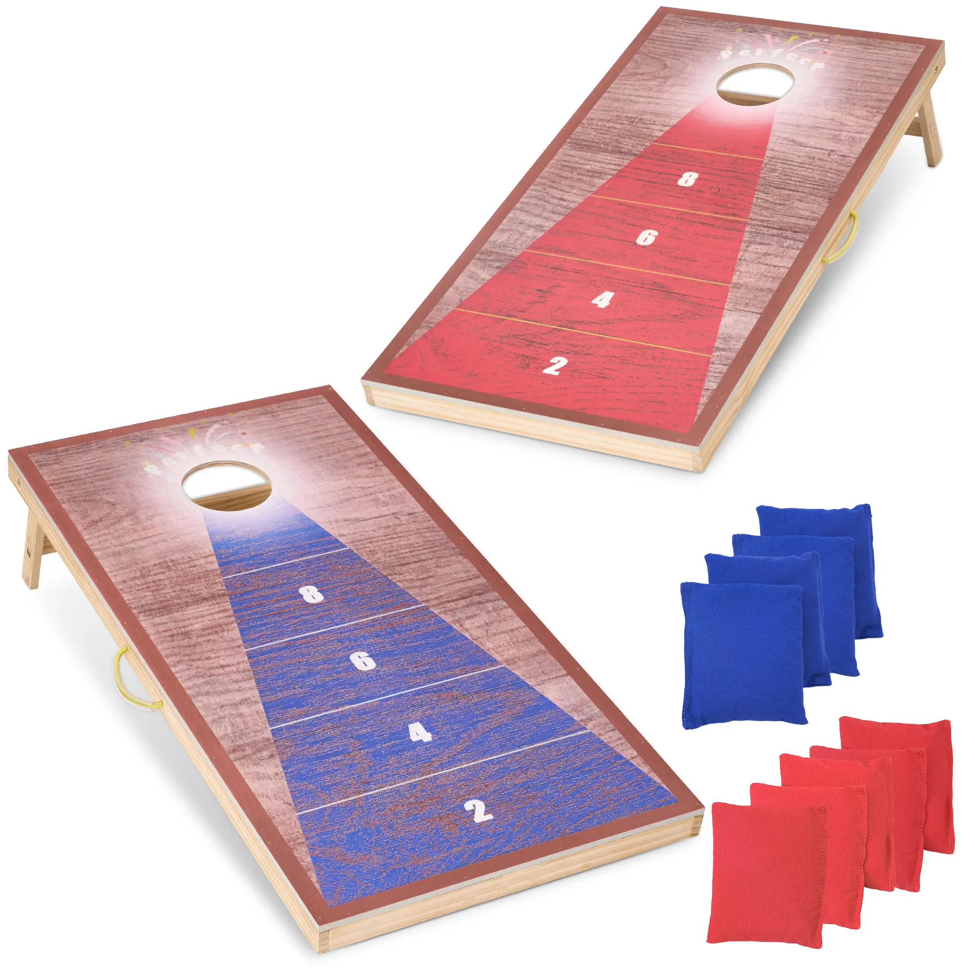 ·The score boundaries on the surface of the cornhole game are printed with wear-resistant ink, featuring bright colors that allow players to quickly determine their scores. This enhances the fun and competitiveness of the cornhole boards game. Whether beginners or experts, everyone can easily get started with the cornhole set and enjoy the game.