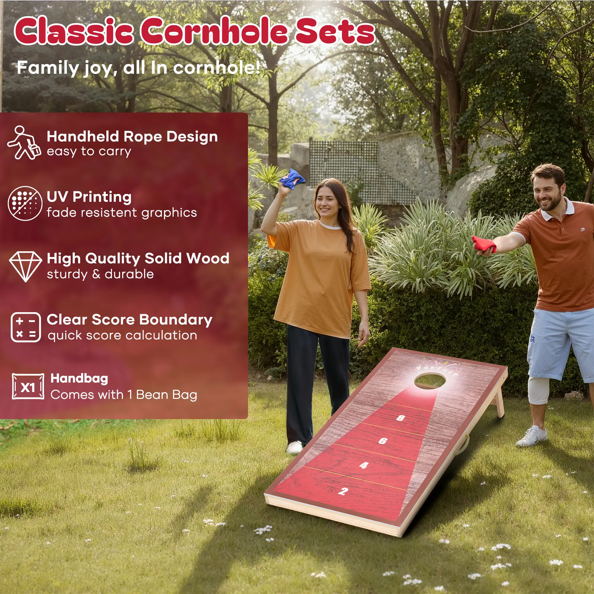 ·The frame of the cornhole boards is made of solid pine wood and has undergone meticulous polishing treatment. The surface of the cornhole game is smooth. The wooden structure of the cornhole set is sturdy and durable, and to some extent, it is designed to resist scratching. Even with long-term use, the sandbag boards is unlikely to deform or crack, making it a reliable partner for your outdoor entertainment.