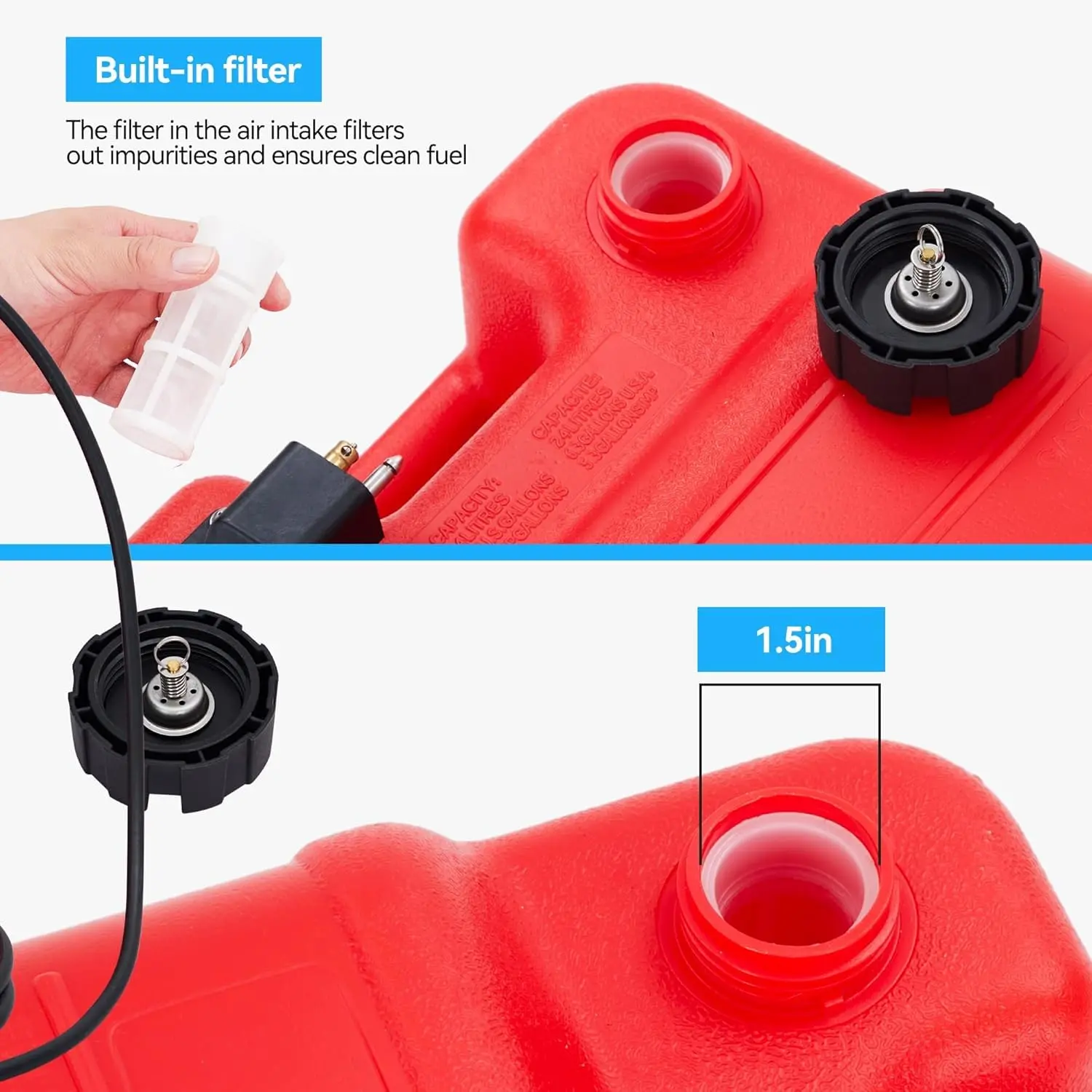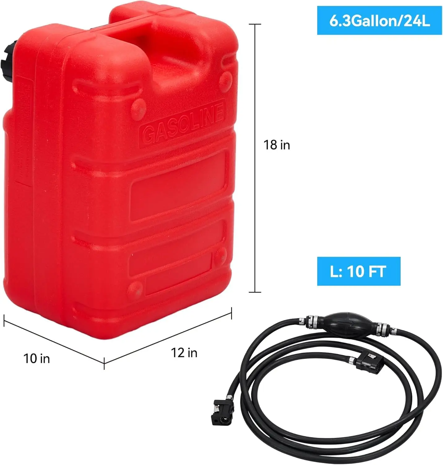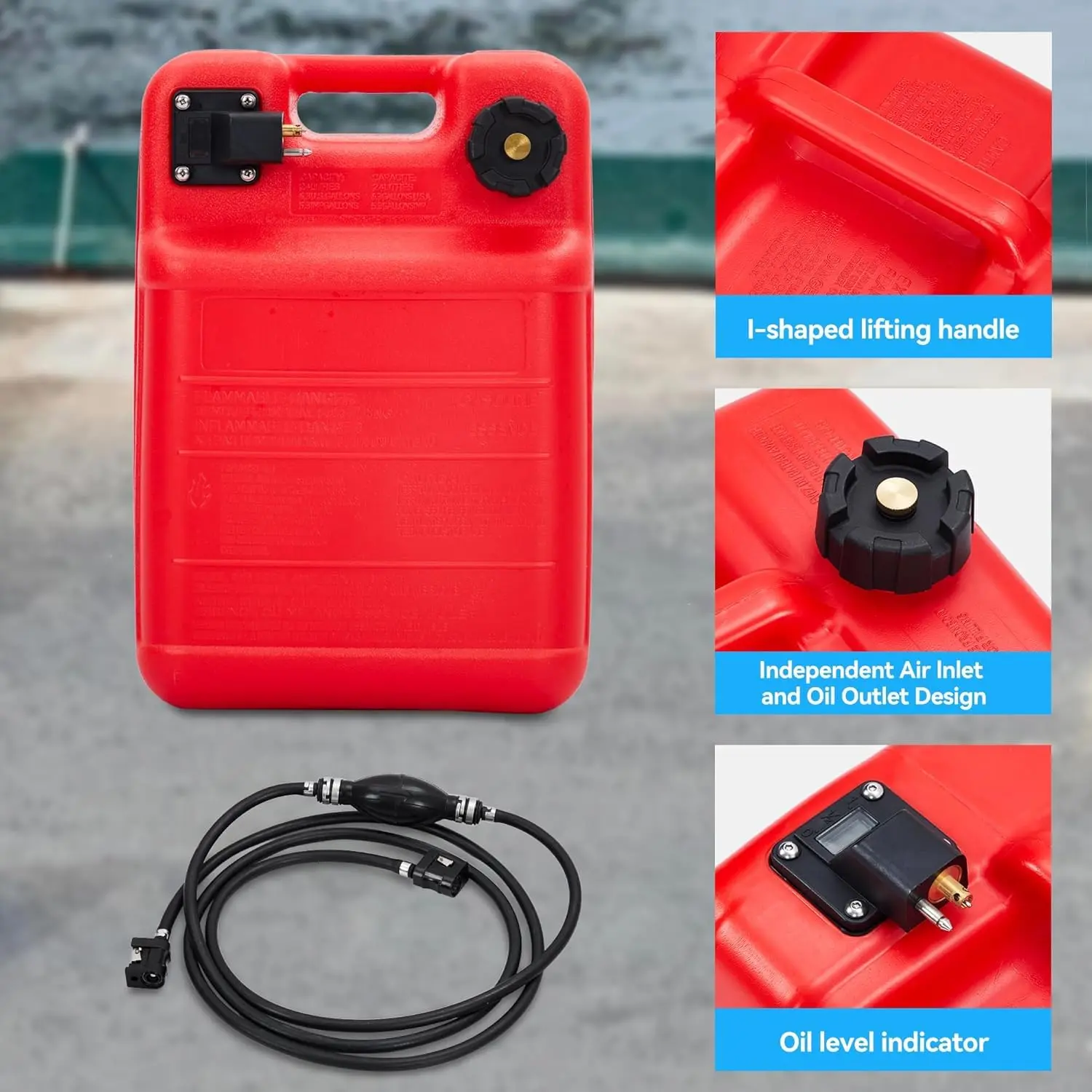 This 6 gallon portable fuel tank is a must-have for your boat, inflatable, ATV, or outboard engine. Made from UV-resistant, anti-corrosive polyethylene, it ensures long-term durability in harsh marine environments. The I-shaped ergonomic handle makes it easy to carry. Featuring a dual-mode vent cap, it offers a secure seal during transport and a venting option while in use. With a complete fuel line and priming pump bulb, this outboard motor fuel tank allows for smooth, safe fuel transfer on the go. Whether you're deep-sea fishing or riding across lakes, this 6 gallon boat tank provides the reliability and convenience you need.
