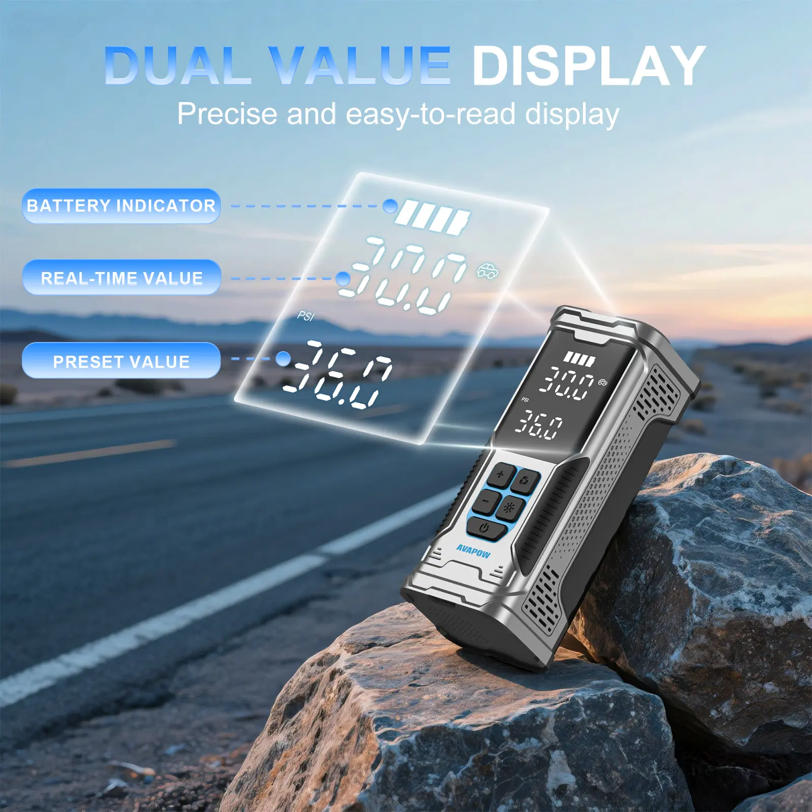 ·ACCURATE DISPLAY & AUTOMATIC SHUT OFF - This tire inflator features a high-precision pressure sensor and dual LCD screens. Backlit digital pressure gauge shows real-time pressure values and preset values with ±1 PSI accuracy. The portable air pump will automatically stop when the target tire pressure is reached, preventing over-inflation. (Note: Incompatible with heavy-duty tires)