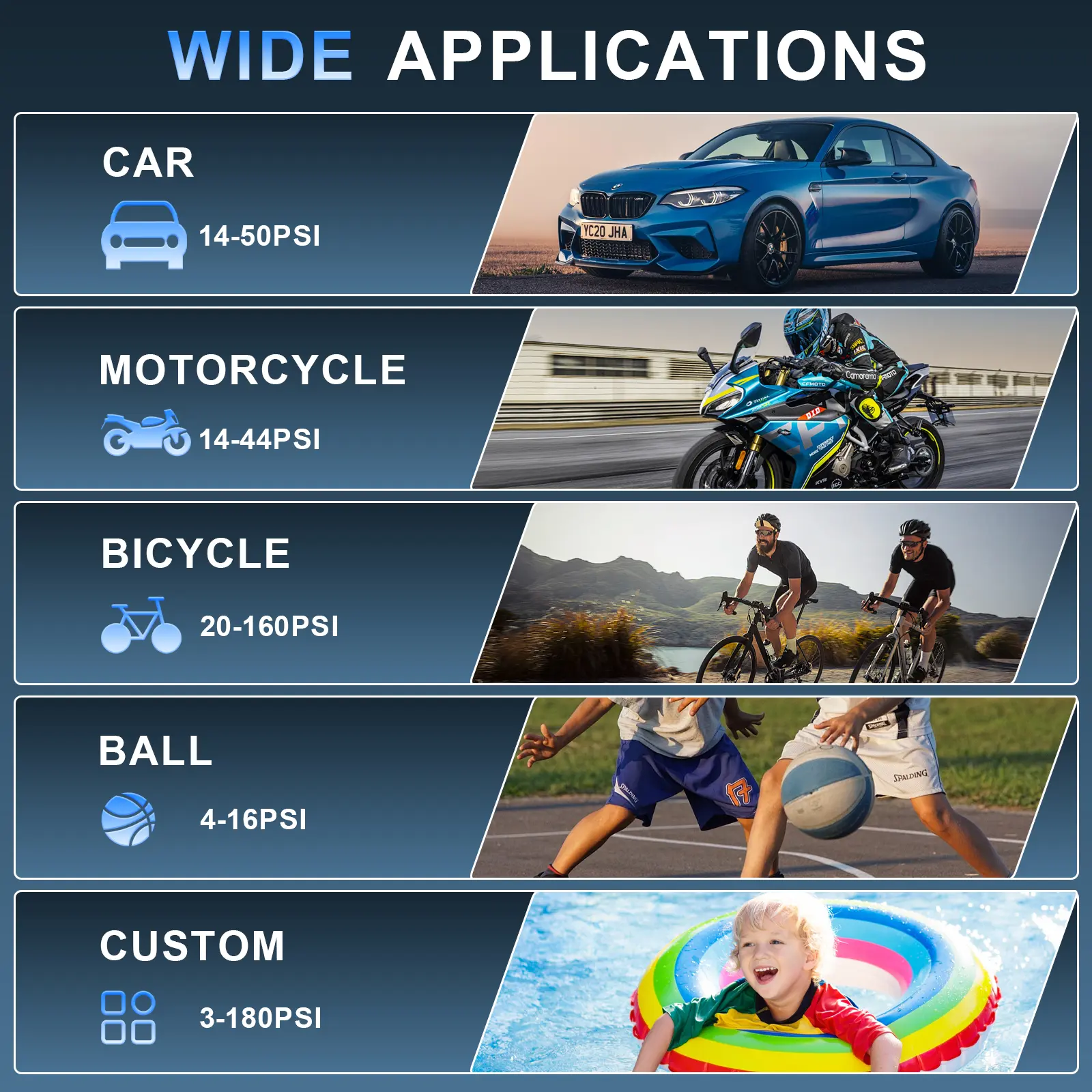 ·EASY TO USE & WIDE APPLICATION - The car tire pump allows you to choose from 4+N inflation modes (car, motorcycle, bicycle, ball, and custom) to match all your needs. Switch easily between 4 pressure units (PSI, Bar, kPa, and kg/cm²) for maximum flexibility. The custom mode lets you preset any pressure value from 3-180 PSI, making it perfect for e-bikes, inflatables, and more. Compact and lightweight design fit easily in a glove box, backpack, or trunk, making it convenient to carry.