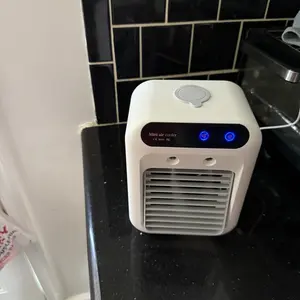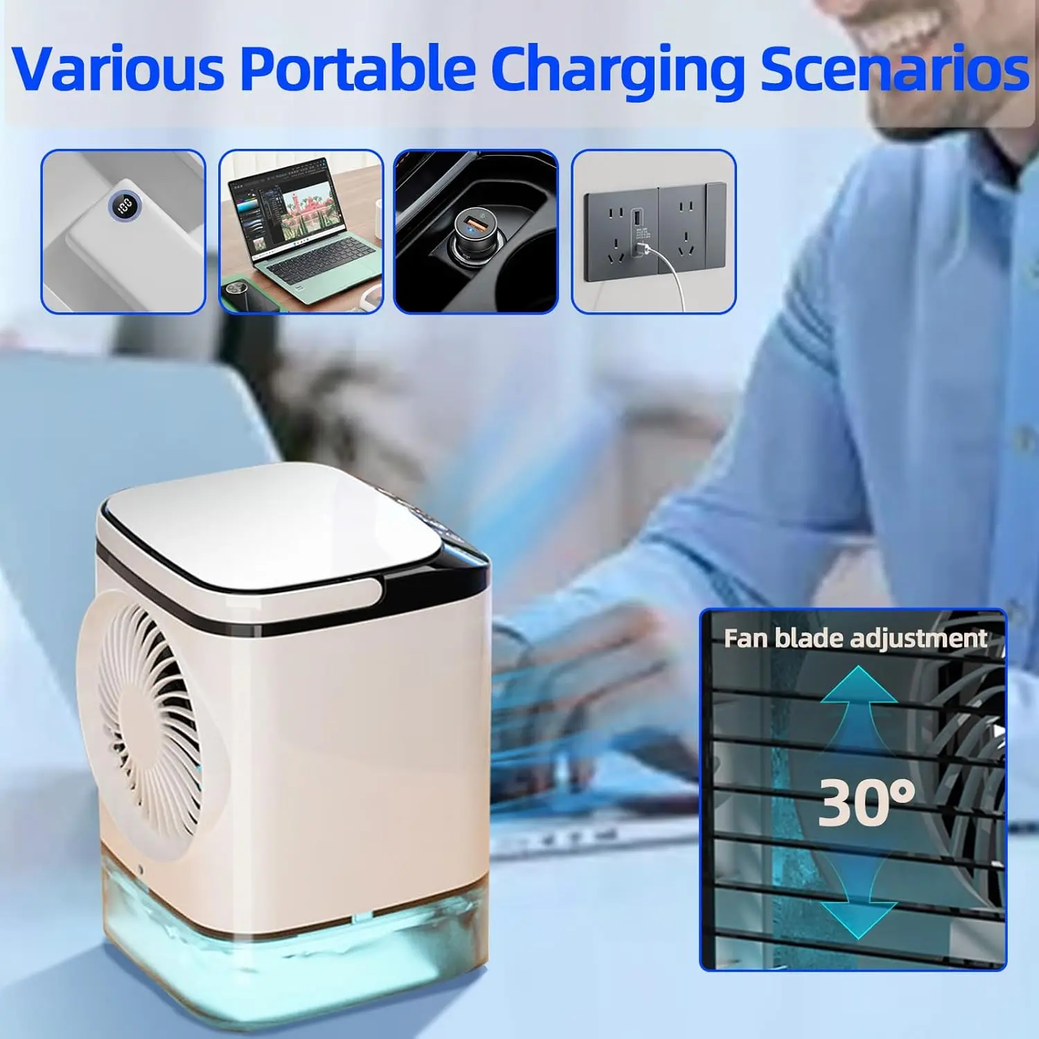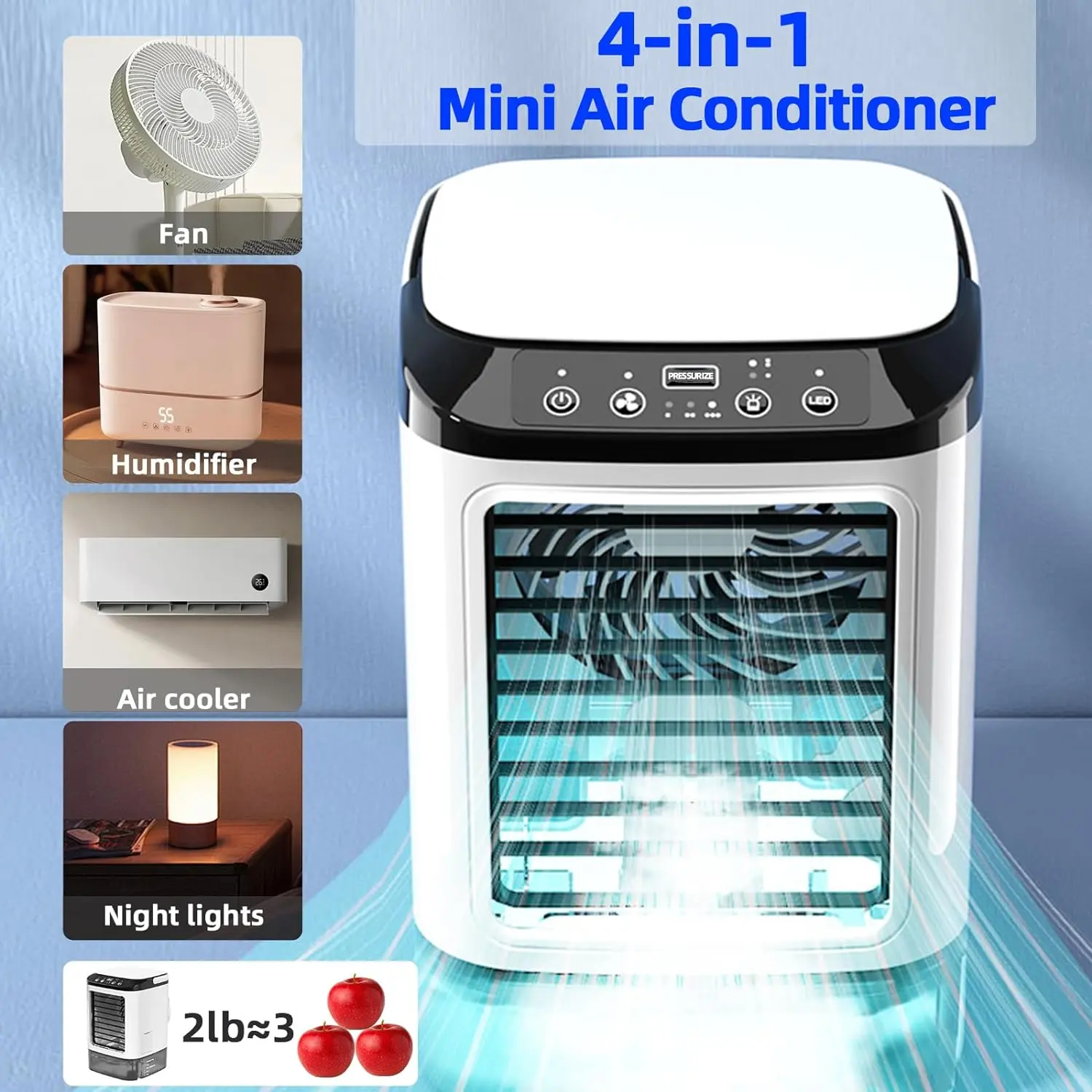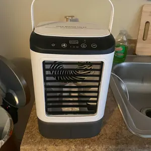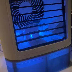 【4-in-1 portable air cooling fan】With a regular fan mode (no water or ice needed), a humidifier mode (just add water), a portable air conditioner mode (add water and ice), and a night light function, this product is perfect for all of your cooling needs. Simply add water and ice cubes to the tank, and watch as it quickly cools down hot, dry air in just 5 seconds.
