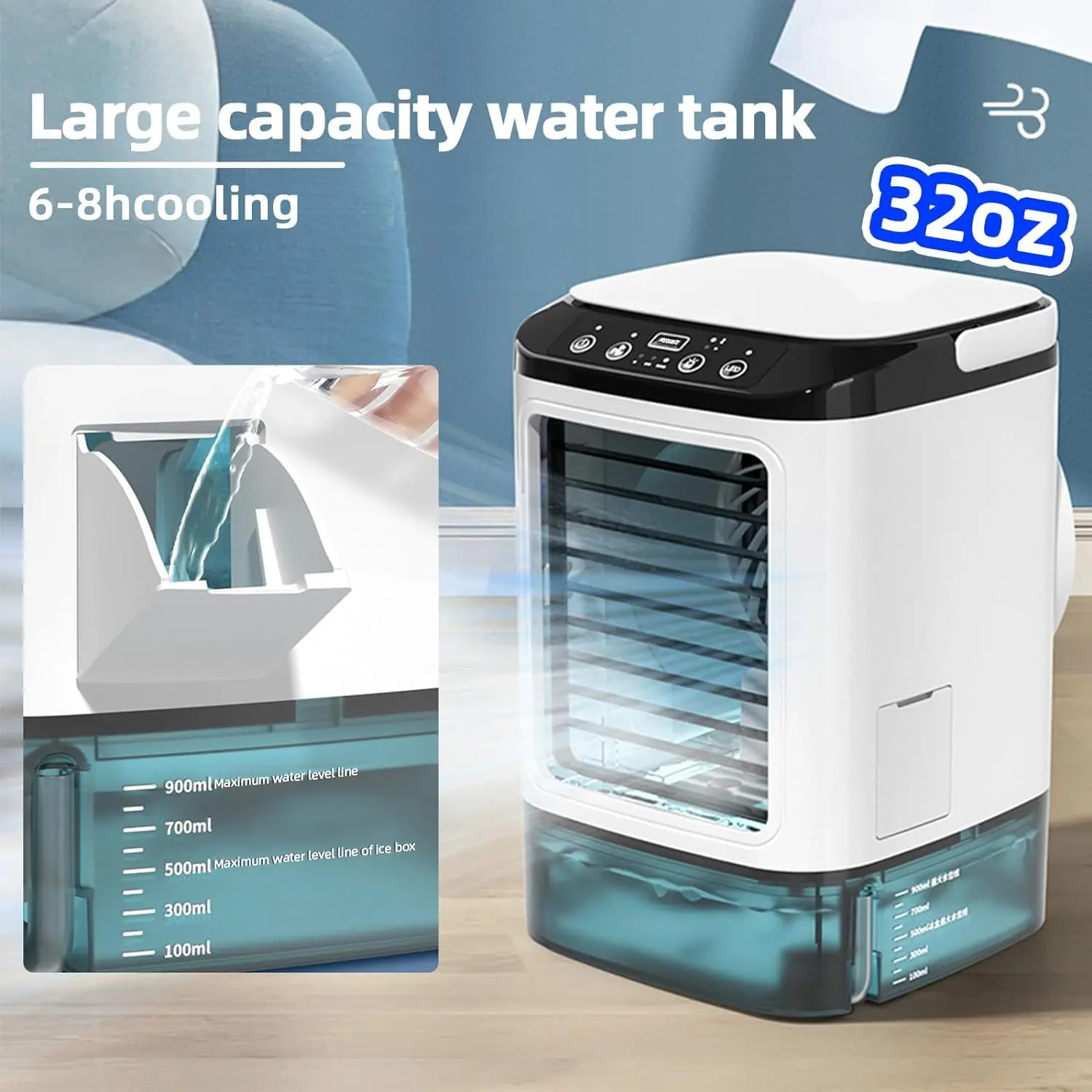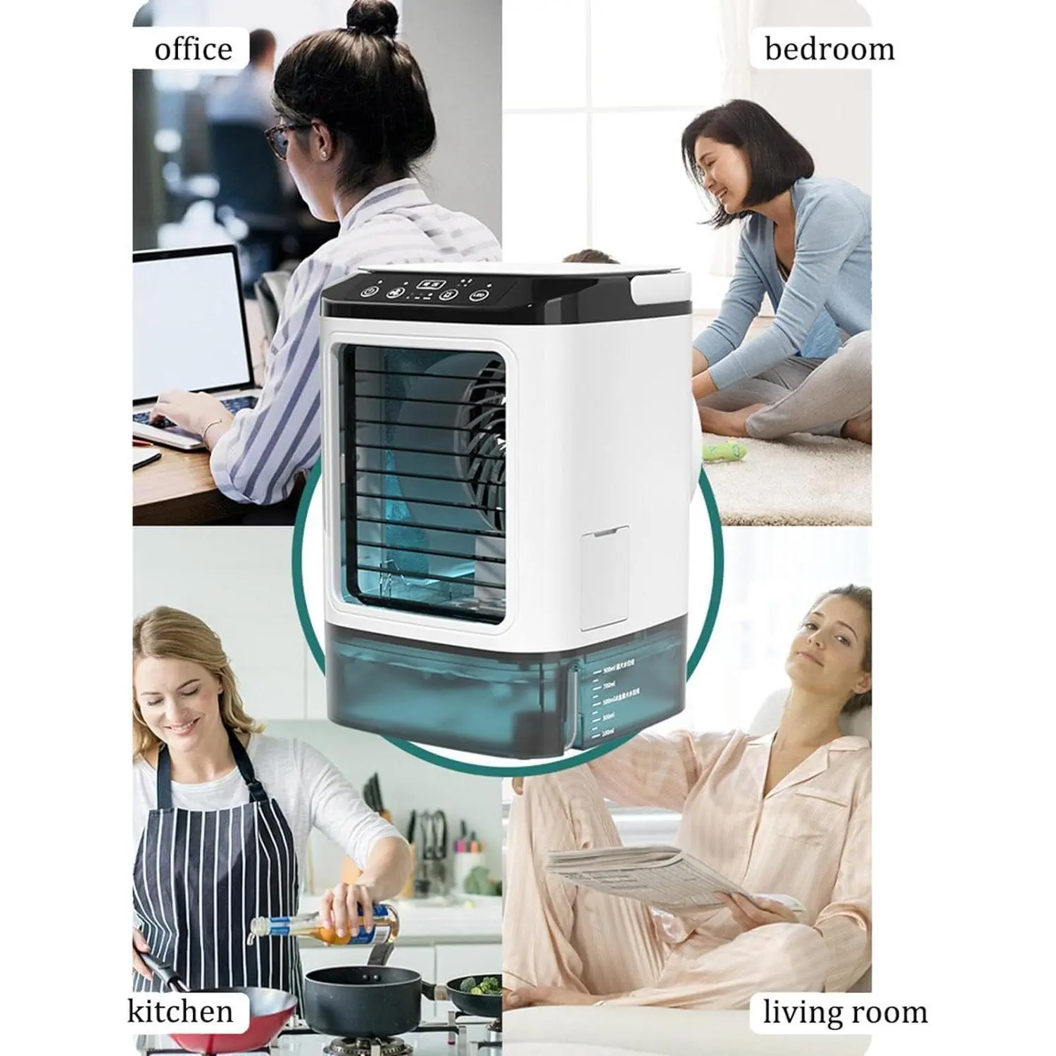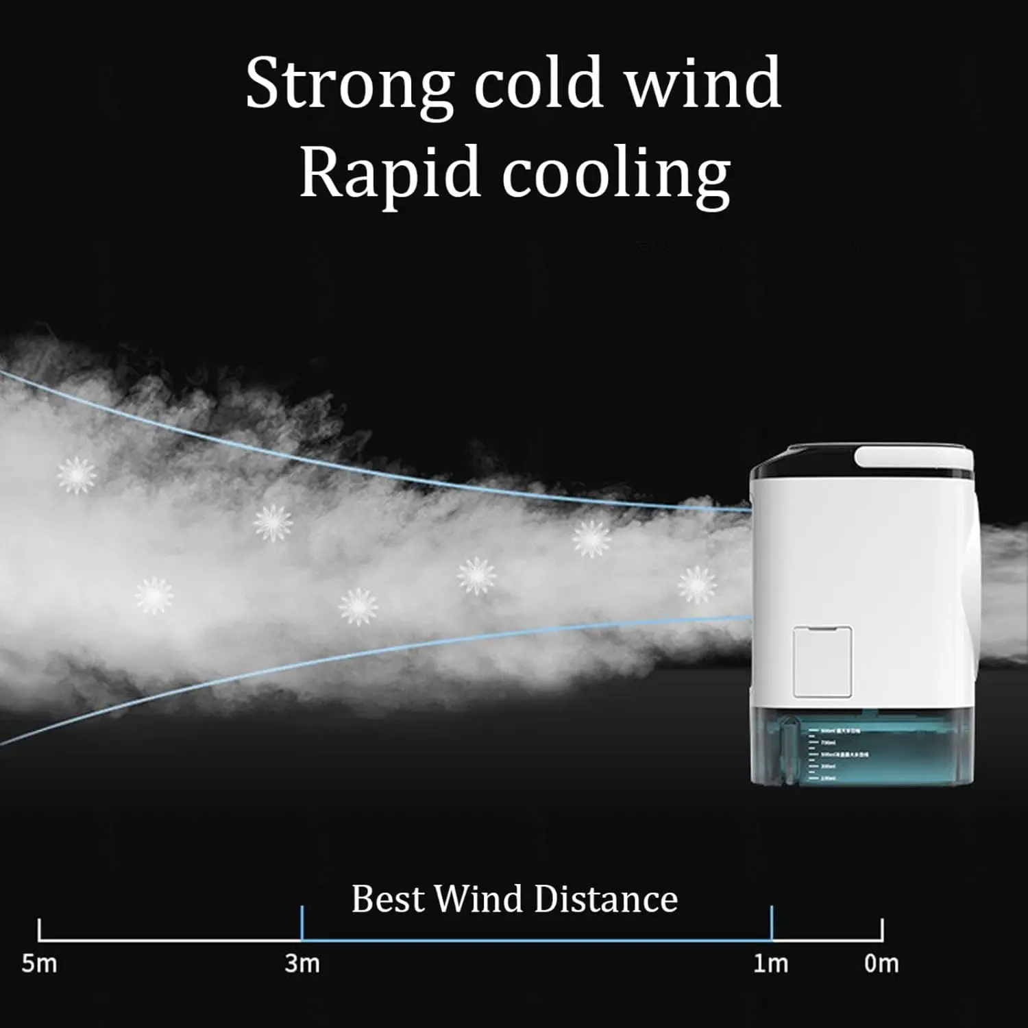 【4-in-1 portable air cooling fan】With a regular fan mode (no water or ice needed), a humidifier mode (just add water), a portable air conditioner mode (add water and ice), and a night light function, this product is perfect for all of your cooling needs. Simply add water and ice cubes to the tank, and watch as it quickly cools down hot, dry air in just 5 seconds.