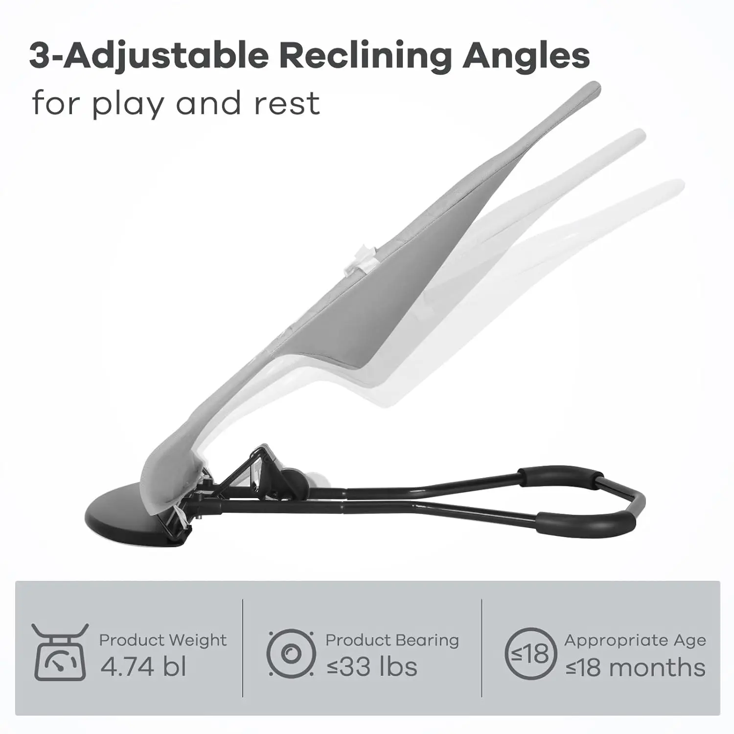 ·Safe & Adjustable - A rocking chair with an adjustable 3-point harness and three different tilt angles ensures your baby enjoys safely while rocking in states of play and rest. Provides a safe place to play for newborns 4-18 months and babies up to 33 pounds.
