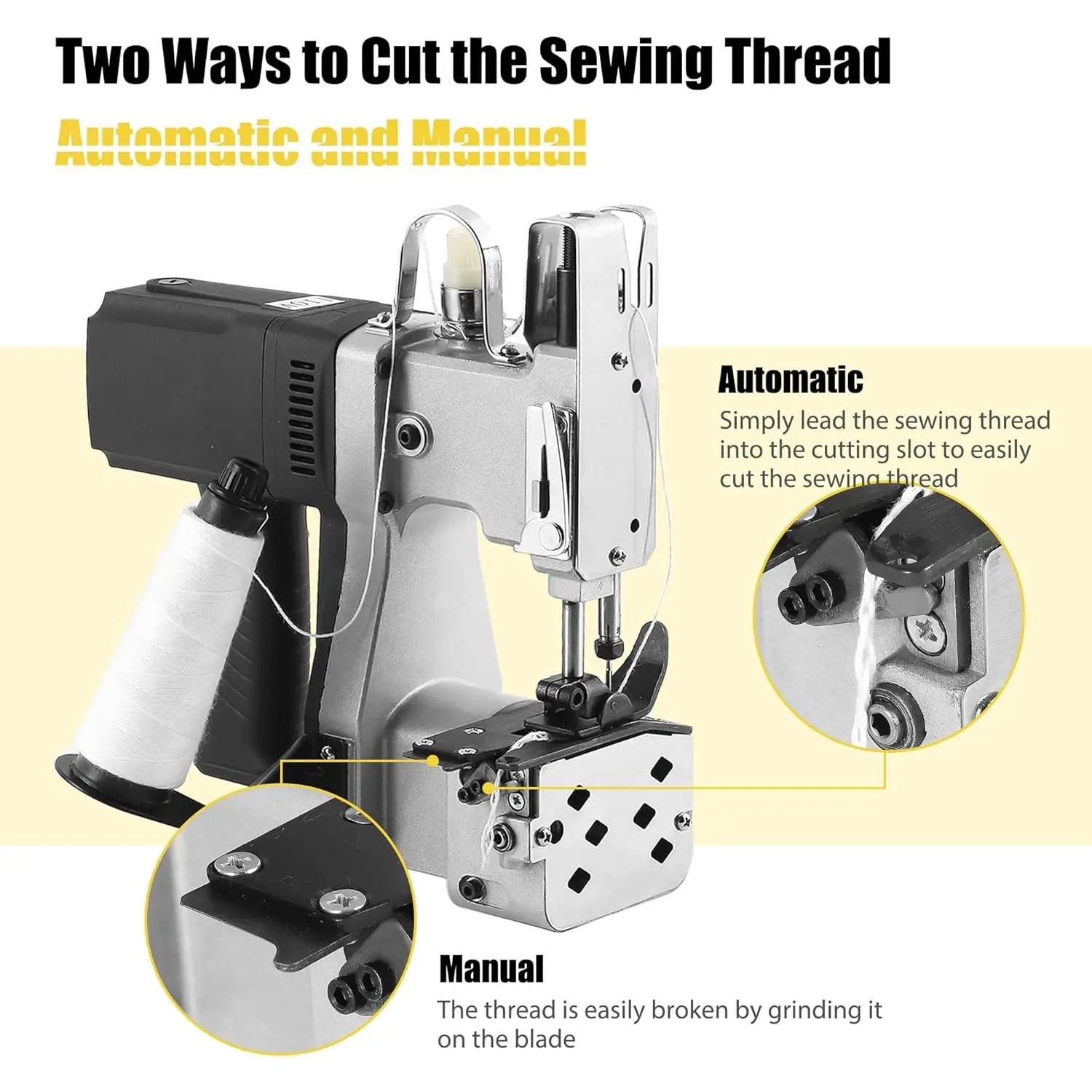 Two Ways of Thread: The bag closer has automatic and manual thread methods. Automatic: simply lead the sewing thread into the slot to easily cut the sewing thread. Manual: the thread is easily broken by grinding it the .