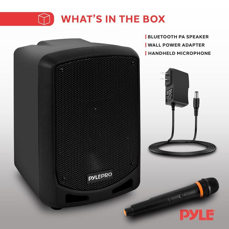 The Pyle Compact & Portable Bluetooth PA Speaker - Karaoke Sound System with Wireless Microphone, Built-in Rechargeable Battery, MP3/USB/SD - Compact, Portable & Powerful PA Speaker - High-Powered Audio Karaoke Sound System - Built-in Rechargeable Battery - Bluetooth Wireless Audio Streaming - Digital Audio Recording Mode - Sound System: 6.5'' Subwoofer, 3'' Treble Speaker - Rear Panel Button Control Center - Includes Wireless Microphone - 1/4'' Microphone Input - Aux (3.5mm) Input - Connect & Stream Audio from External Devices - USB Flash + Micro SD Memory Card Readers - MP3 Digital Audio File Playback - Audio Configuration: Echo, Bass and Treble Controls - LCD Digital Display Screen.