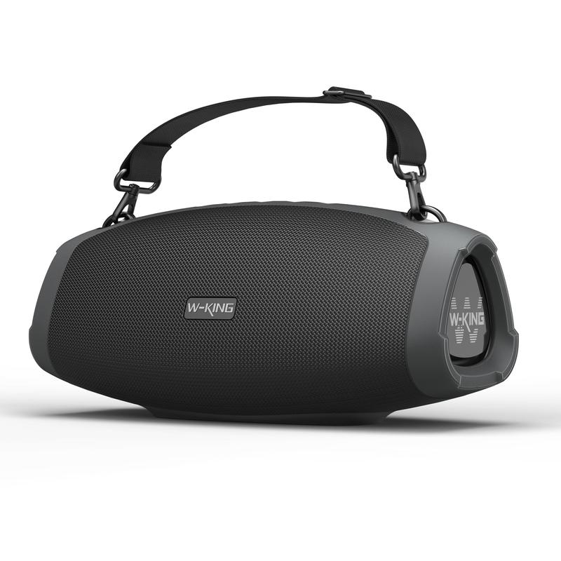 The adjustable, tear-resistant shoulder strap ensures on-the-go convenience. Enjoy up to 42 hours of playtime per charge, perfect for camping. The W-KING speakers offer 2 EQ modes: Indoor (boosted bass) and Outdoor (crisp sound). Durable fabric and rubber housing make them suitable for adventures. They feature a 3.5mm AUX port, TF card slot, and hands-free mic.