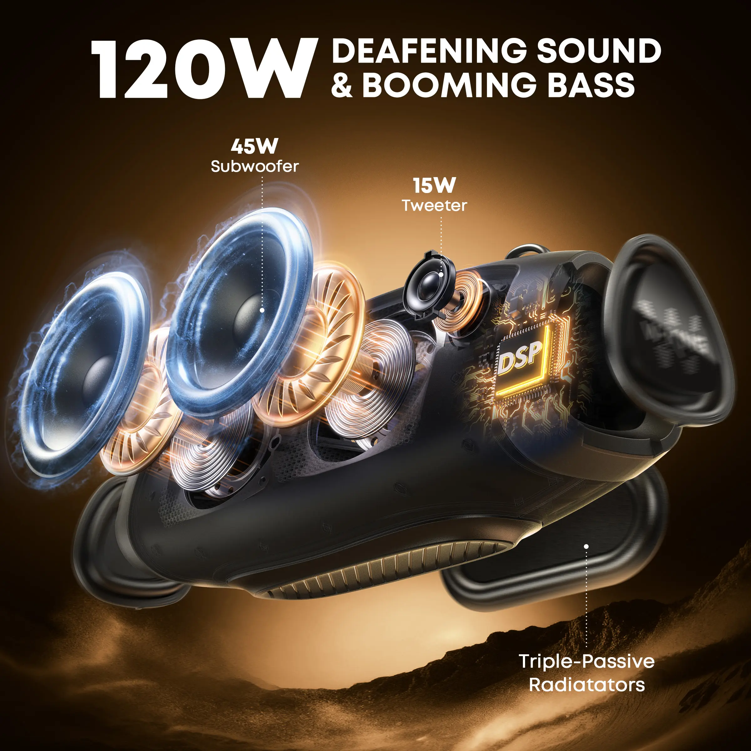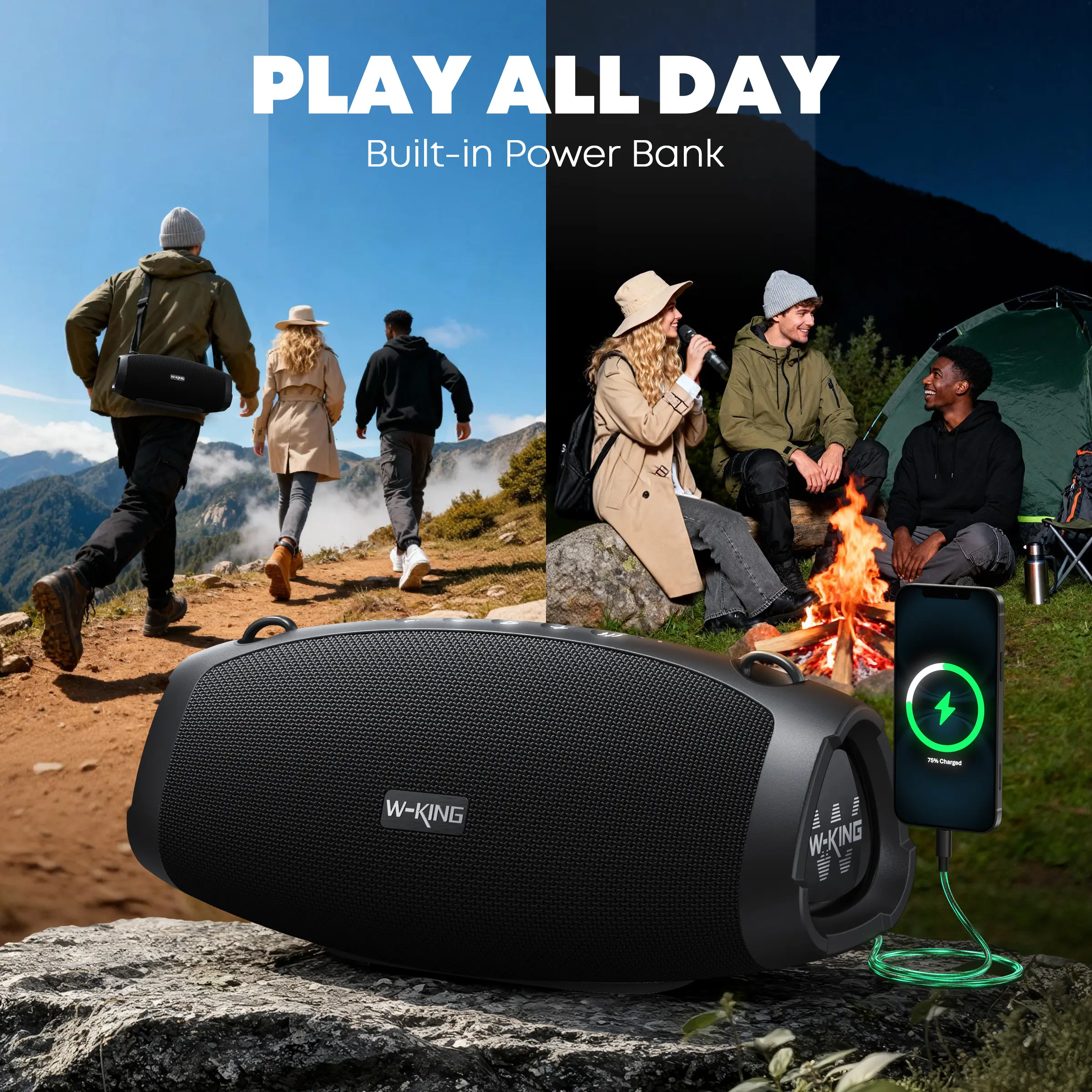·70W RMS (120W PEAK) POWERFUL DEEP BASS: W-KING X10 Loud Bluetooth Speaker is the first on the market with triple passive radiators (2 * 3.5" side and 4.76" back), which can provide a deep bass experience unmatched by other bluetooth speakers. The outdoor portable speakers Bluetooth wireless also equipped with 2*35W subwoofer, 2*10W tweeters and advanced DSP chip to achieve clearer mid-highs, rich and smooth zero-distortion sound, and high-frequency sound up to 40kHz is significantly clearer.