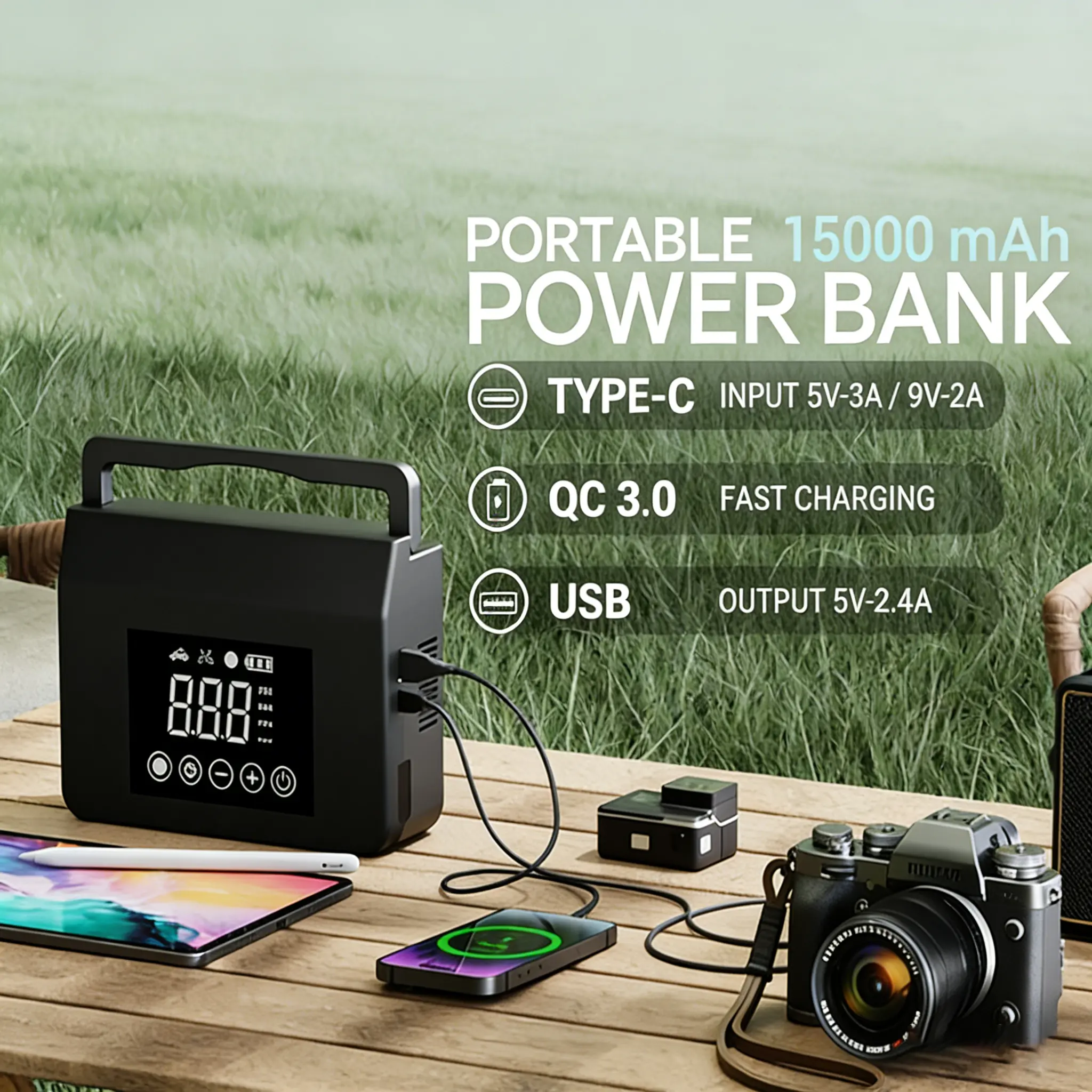 ·【4-IN-1 Multi-Function】Not only a car battery booster, a Tire Pumper, but also a portable power bank, a LED flashlight. Support fast charging/USB 3.0, adapt smart phones, tablets and other USB devices. Input:5V/1A, Output:12V/2A. The integrated 300-lumen LED flashlight has 4 lighting modes, constant lighting, flash and SOS,Warning.