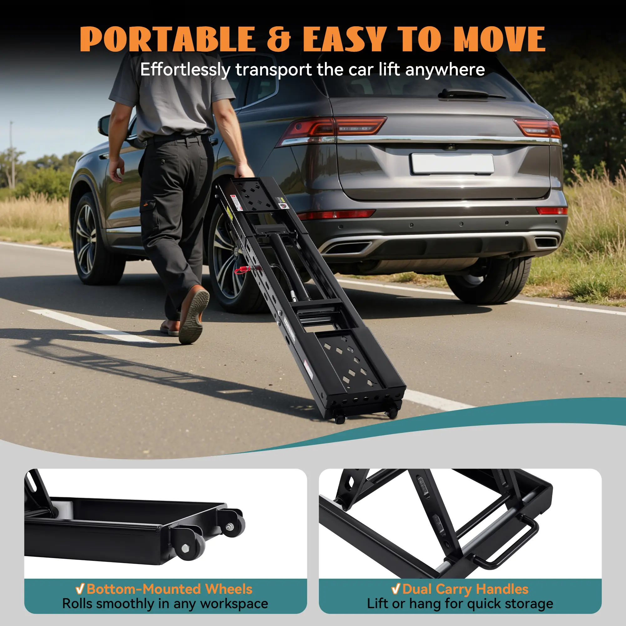·EASY TO MOVE & STORE: This portable car lift features four wheels for easy movement around the garage. When not in use, it folds compactly for storage and includes two sets of wall-mount handles to help save space (hooks or nails not included)