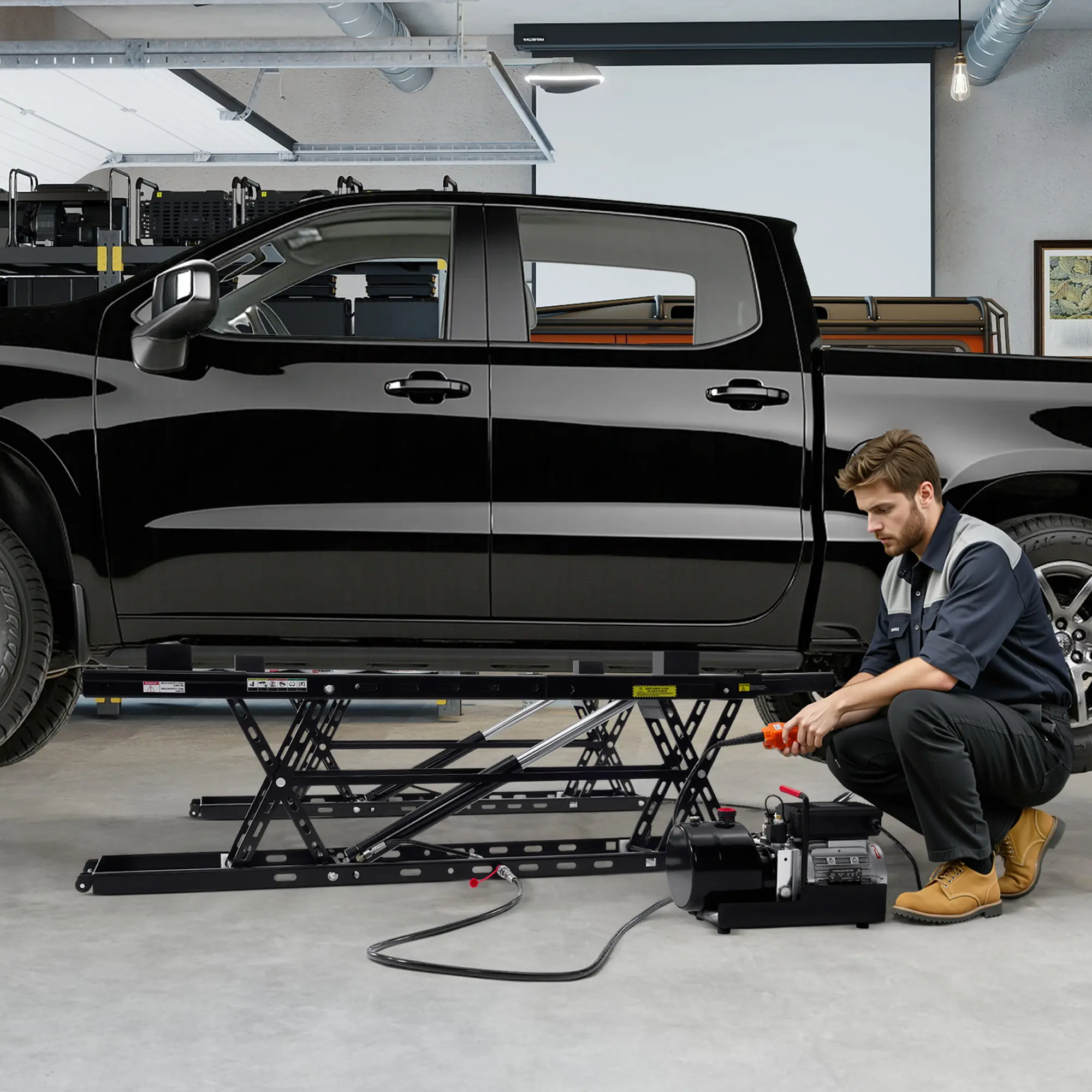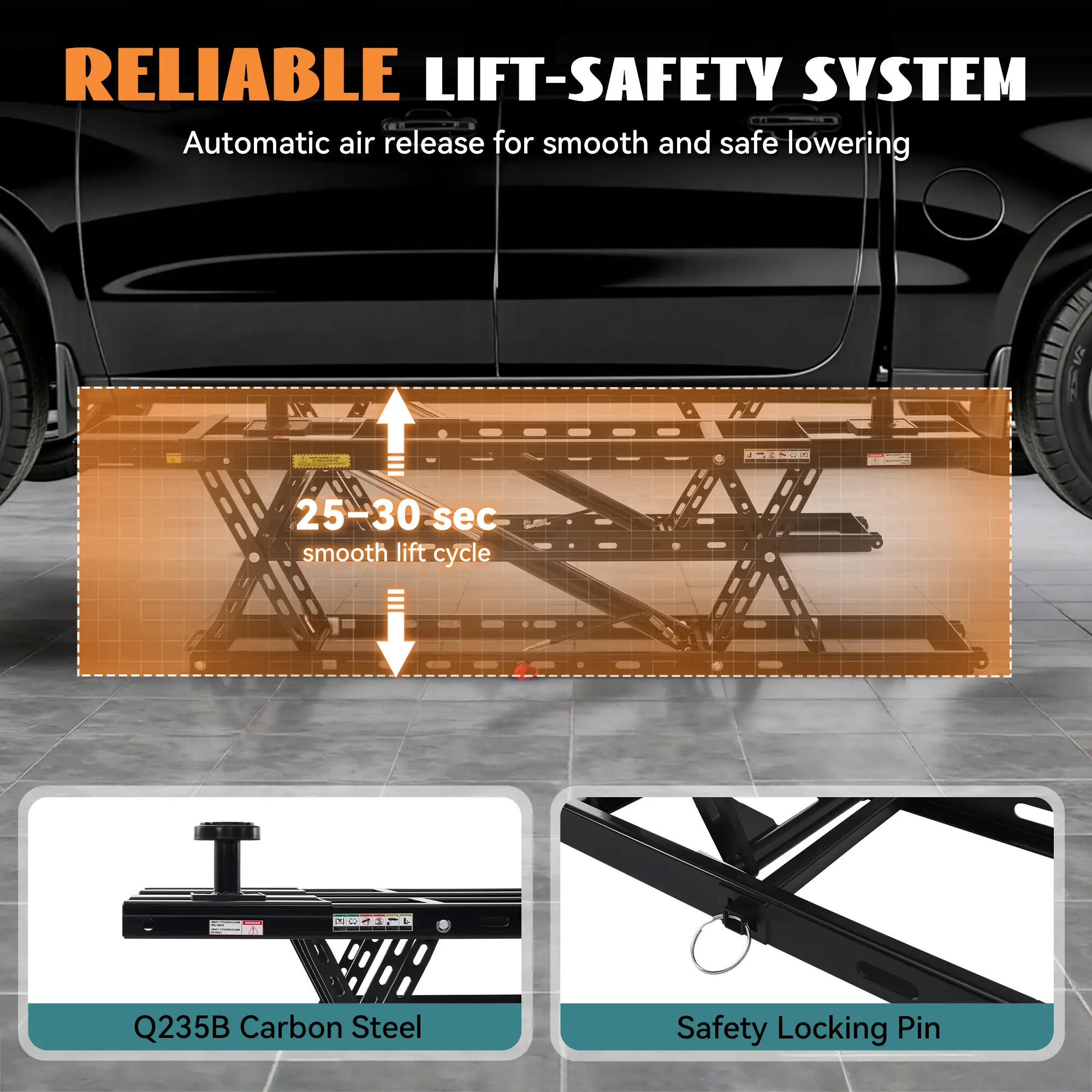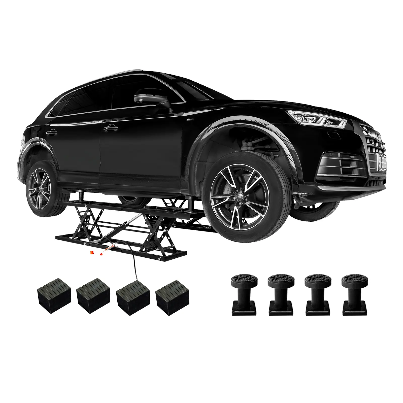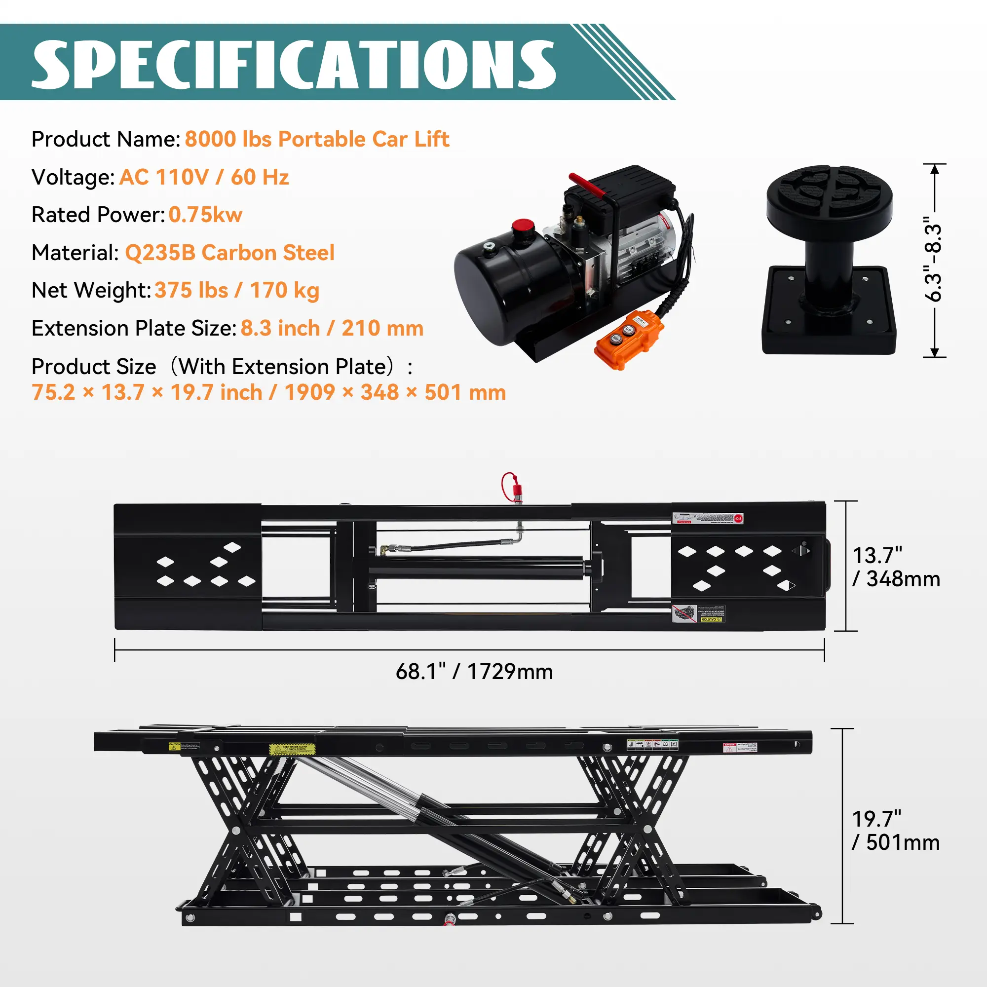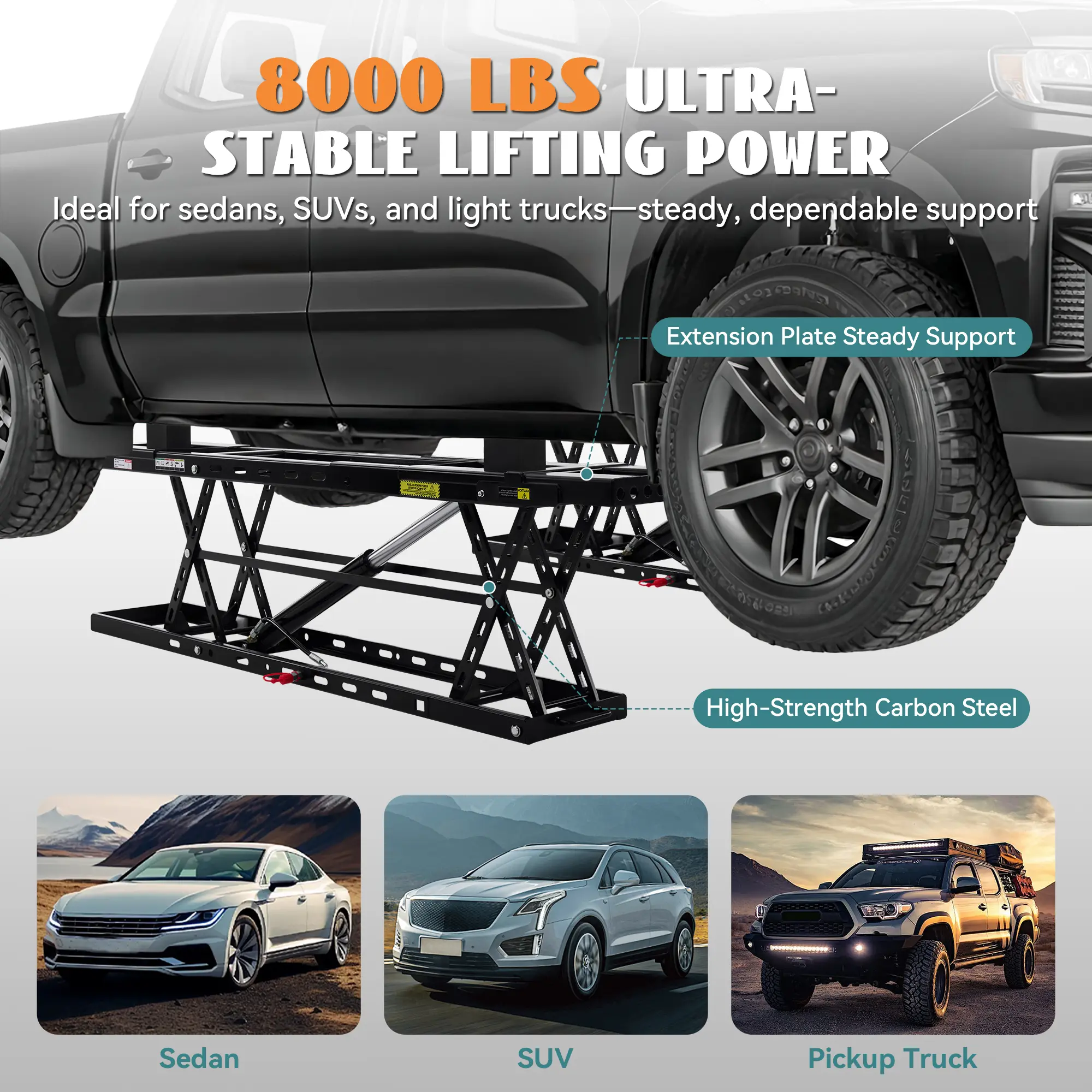 ·HEAVY-DUTY & STABLE DESIGN: Built from Q235B carbon steel, this garage car lift includes a 7" extension plate for a total length of 70.7", increasing contact area for long-wheelbase vehicles, trucks, SUVs, and other mainstream models on flat, solid surfaces