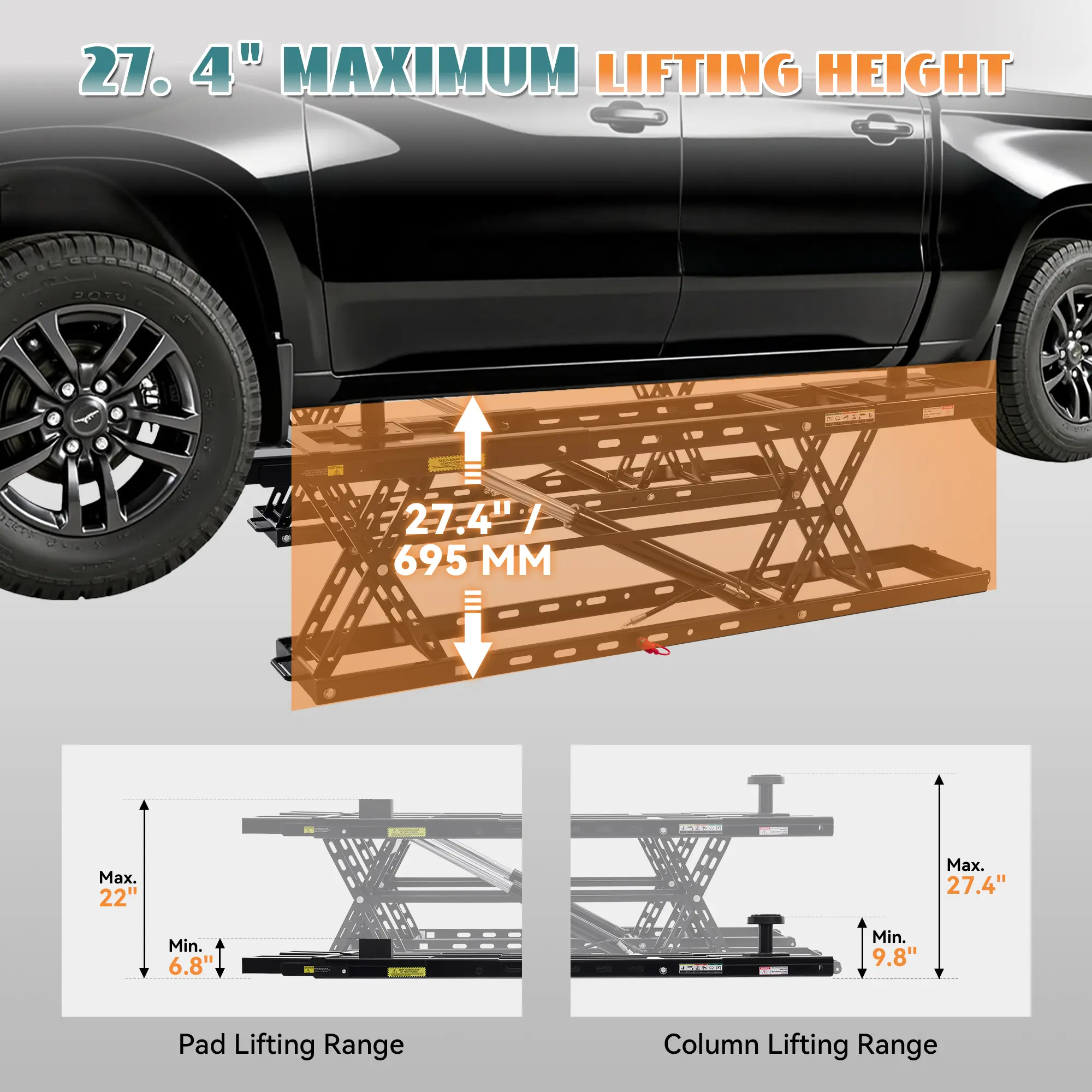·ADJUSTABLE LIFTING HEIGHT: This automotive lift features 4 lifting columns with 17.7"–25.4" whole-body adjustment. Combined with 4 rubber pads, it achieves up to 20" total lift height, providing ample clearance for underbody maintenance and inspections