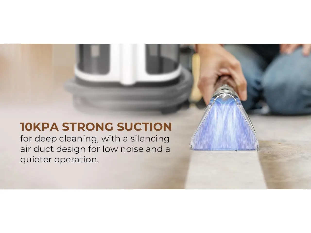 ·10Kpa strong suction for deep cleaning, with a silencing air duct design for low noise and a quieter operation