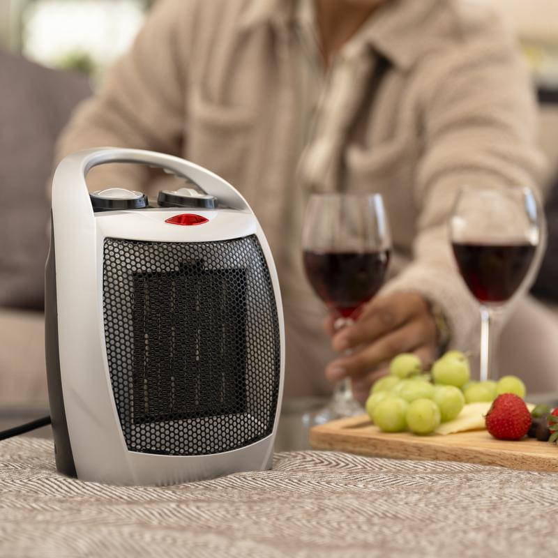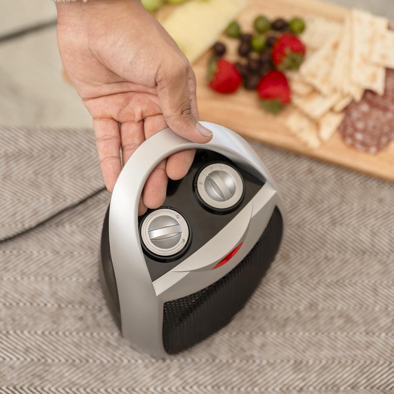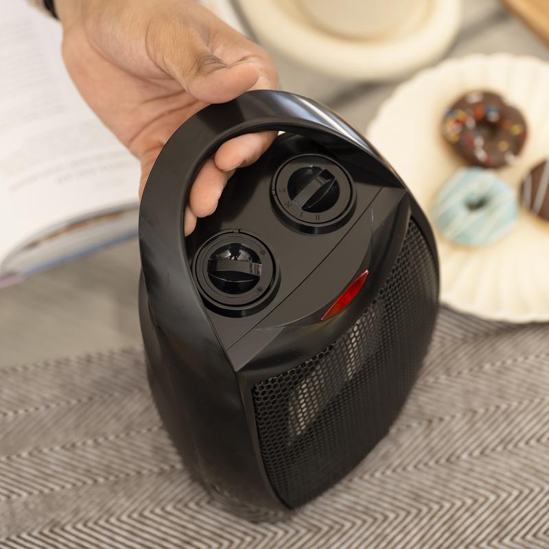 This compact ceramic space heater is perfect for providing warmth in small areas, whether at home or in the office. With its lightweight design, carrying handle, and manual controls, this heater is easy to transport and operate. The adjustable thermostat and three heating modes make it versatile for different needs, offering efficient warmth and a fan-only option.
