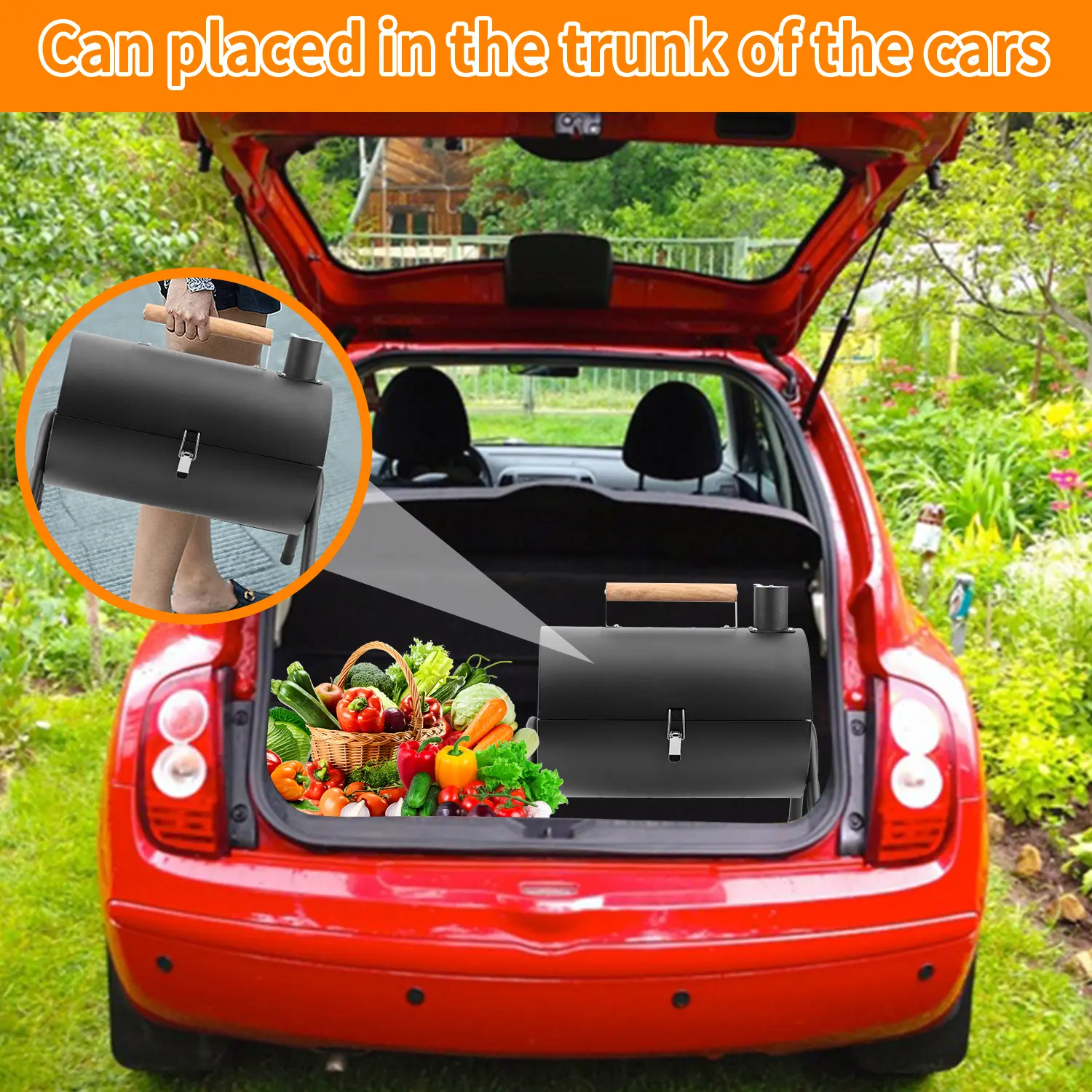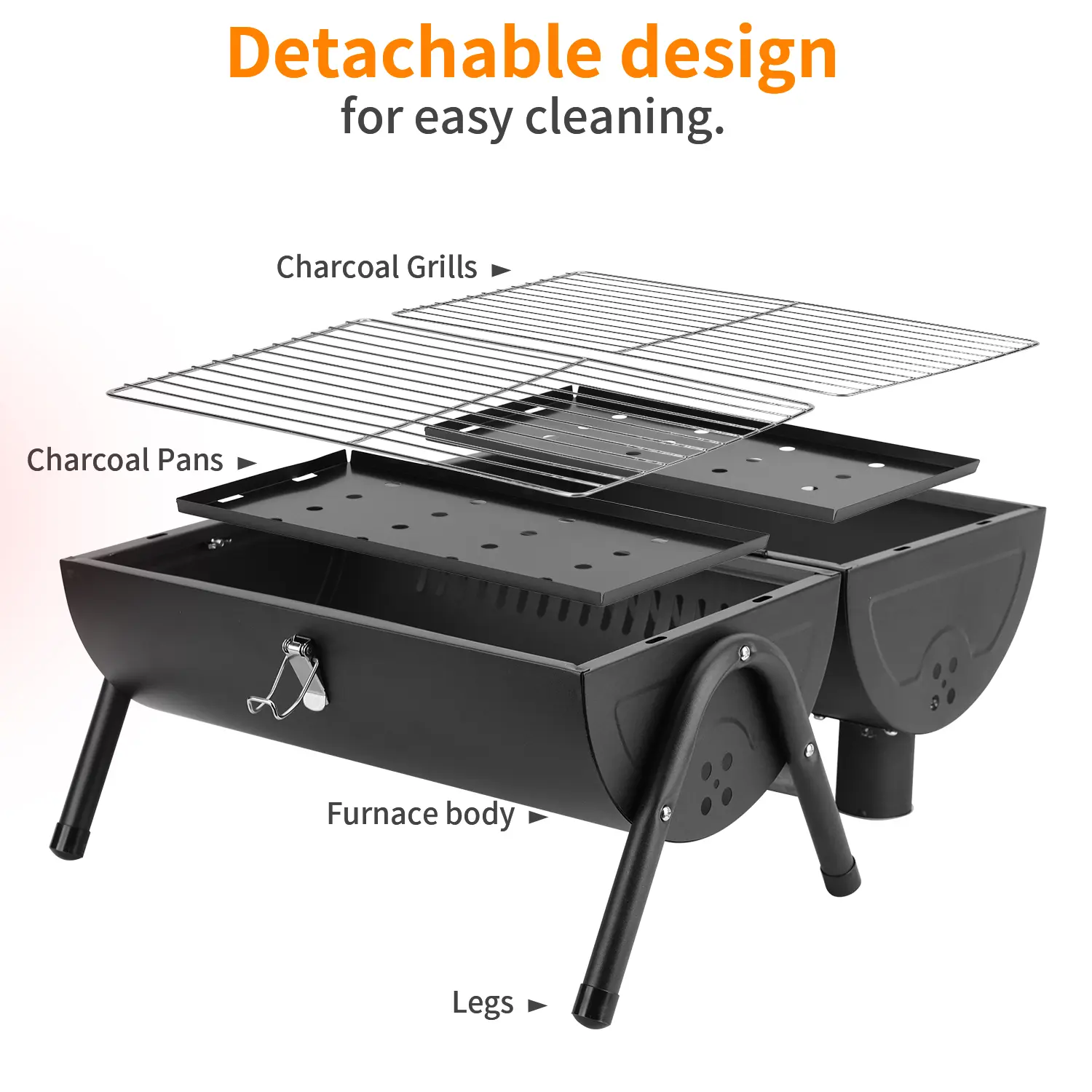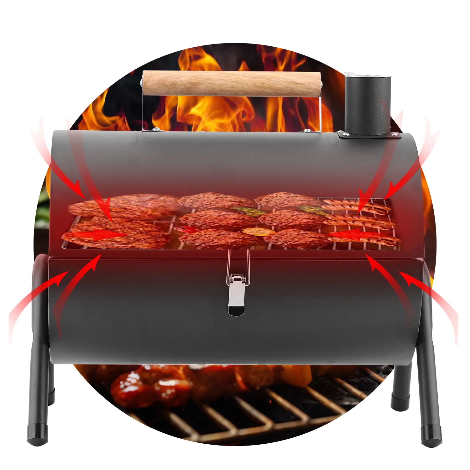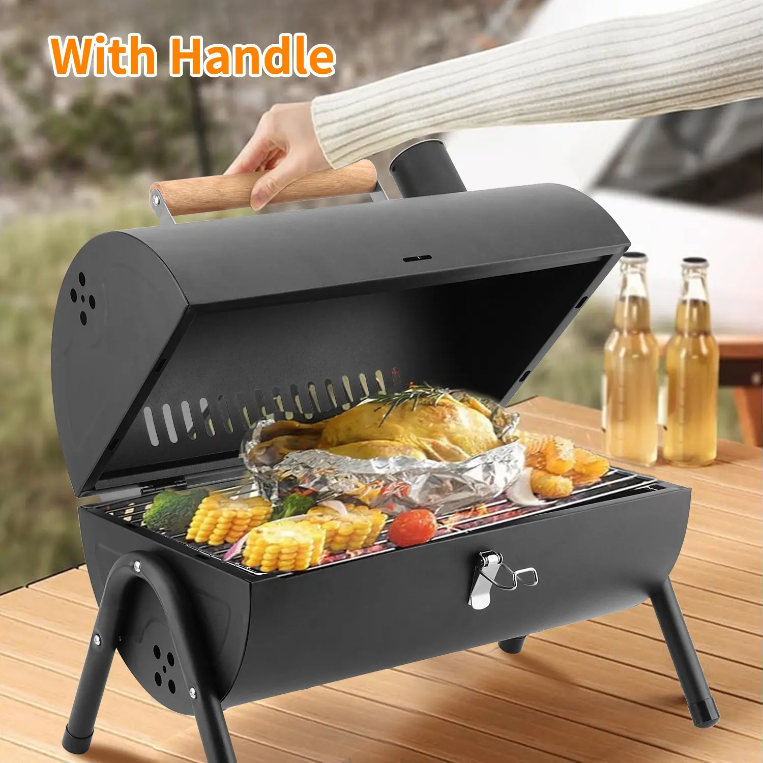 Both triangular support legs strengthen sturdiness of charcoal grill, Standing on floor, table, lawn more stable without waggling, Reinforced lock catch make it effortless to open or close lid, and won’t pop open when you pick it up, Very portable to carry outdoors, Grill lid is supported by 2 pull rods for windproof function, Smooth wooden handle is coated with glossy oil without burrs