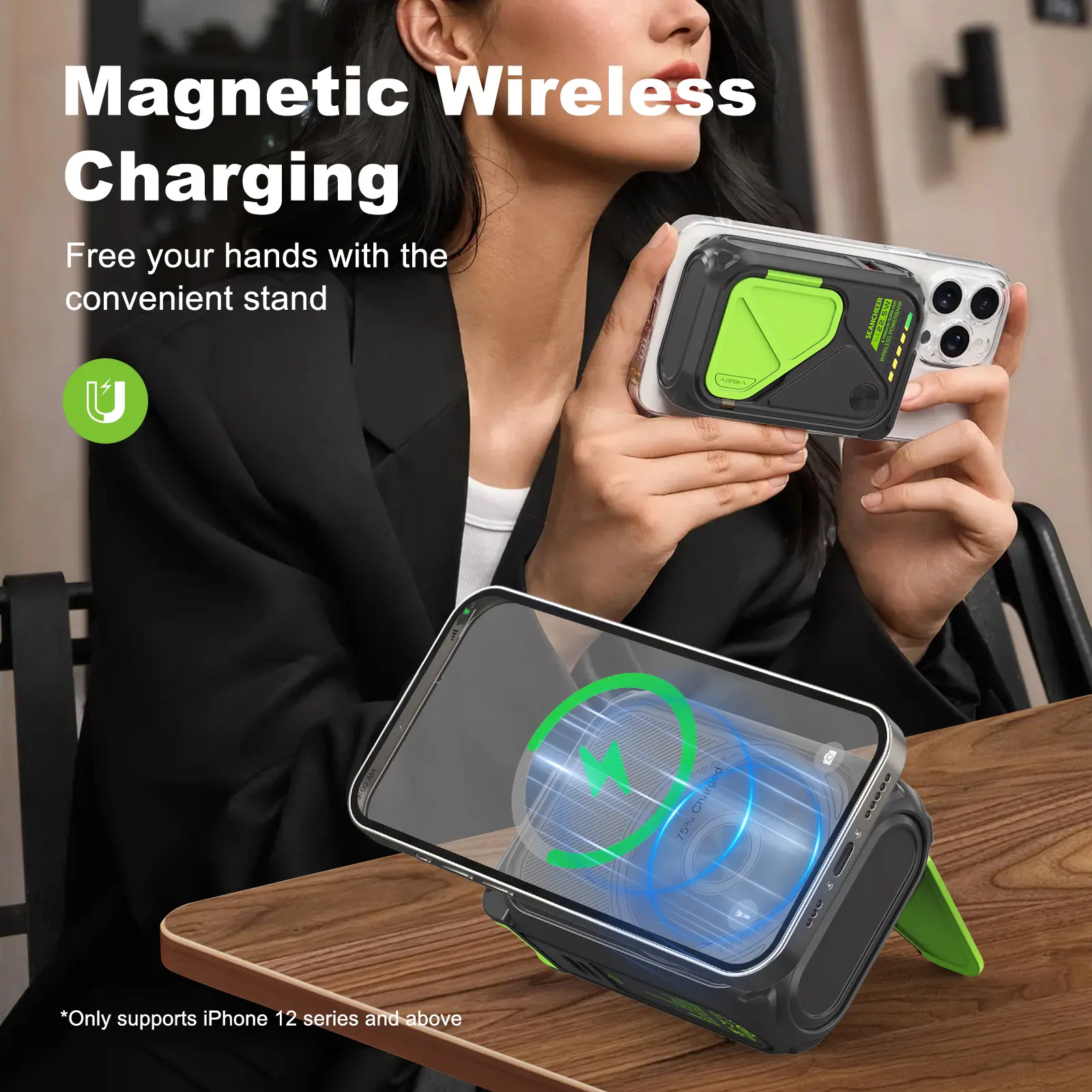 ·【Effortless Magnetic Wireless Charging】Supports up to 15W magnetic wireless charging, no more plugging and unplugging cables. The magnetic design securely holds your device in place, ensuring uninterrupted charging without the risk of slipping. The retractable stand on the back lets you watch videos, read, or make video calls comfortably while charging(Only supports iPhone 12 series and newer models).