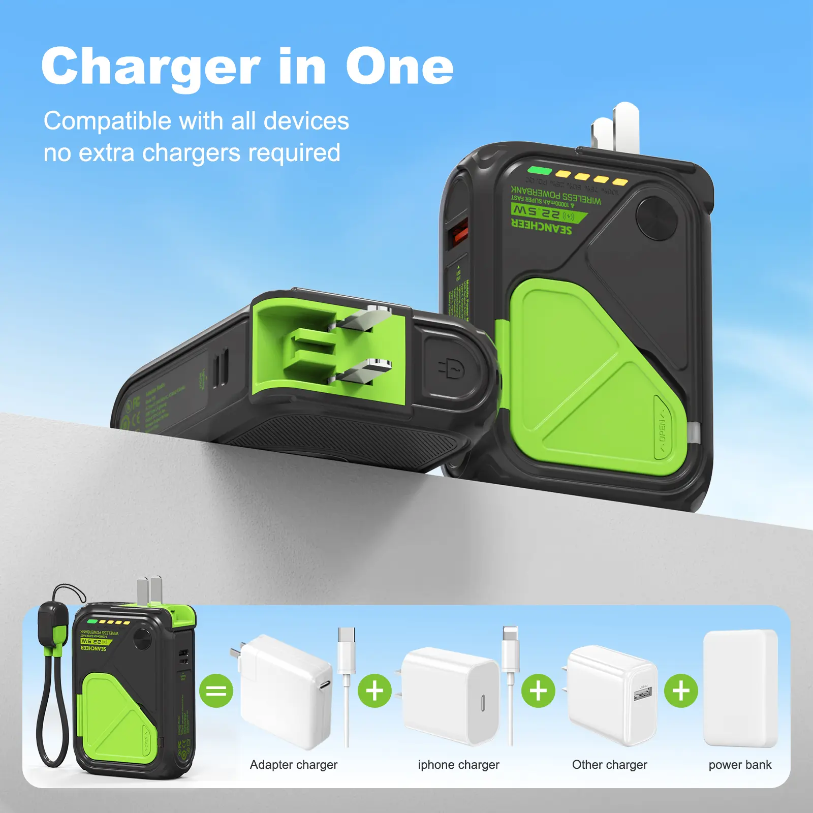 ·【2-in-1 Type-C to Lightning Cable】Enjoy seamless charging with the included Type-C to Lightning cable, compatible with both Apple and a wide range of Android devices. This 2-in-1 design keeps cables neat and tangle-free. The cable is attached neatly to the lanyard, providing quick access and tidy storage.