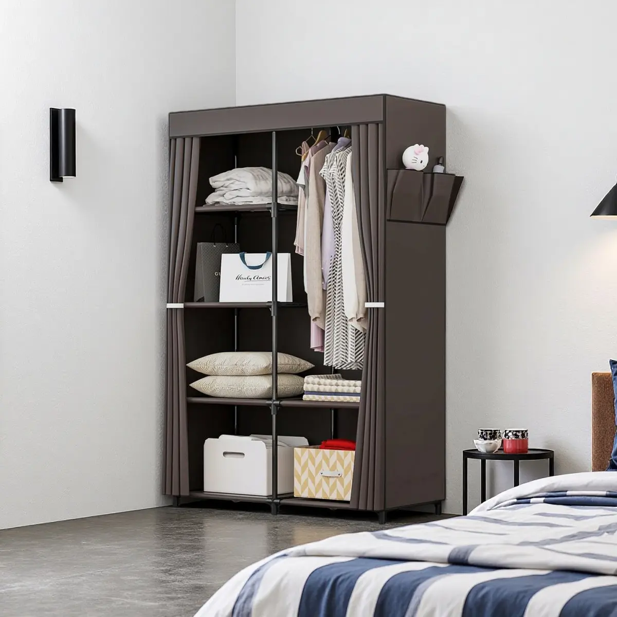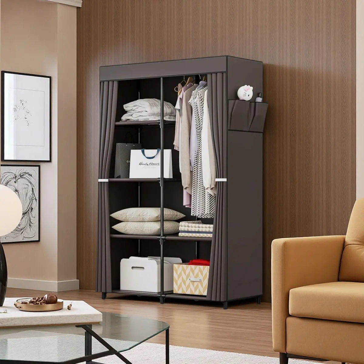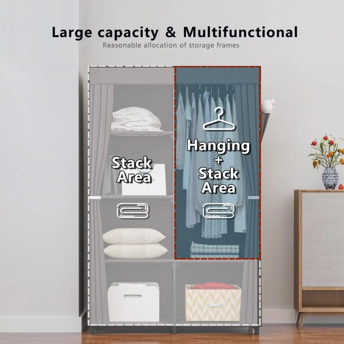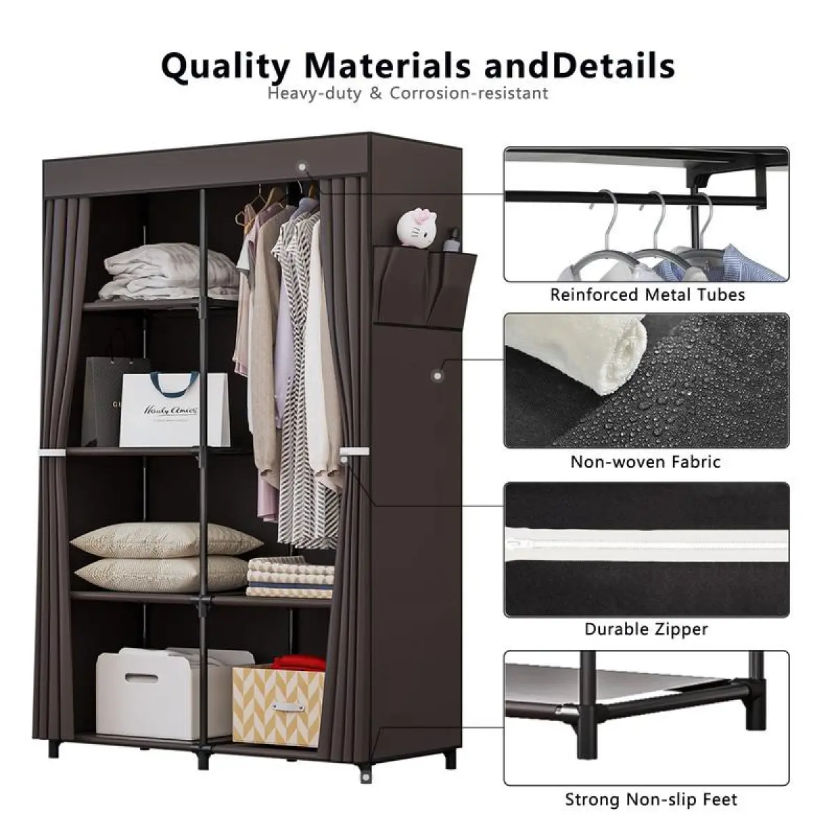 Industrial-grade metal tubes + tear-resistant non-woven fabric ensure long-term durability.Slim 34" depth fits tight spaces while holding 8 hangers + 4 shelves