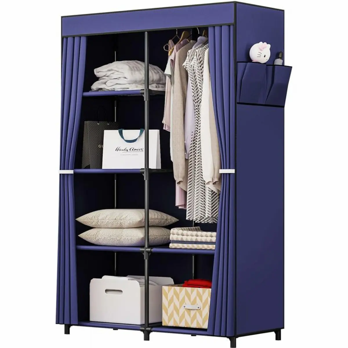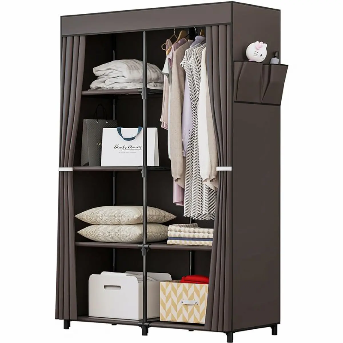 Water-resistant fabric curtain (wipe clean with damp cloth) protects suits/jeans from spills and dust.Roll-up design for quick access