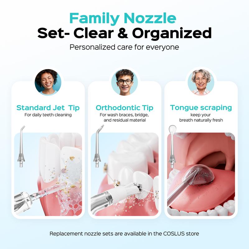 The COSLUS C51 water flosser innovatively combines 6 water pressure levels with 3 dedicated cleaning modes, offering 18 precise pressure combinations. The modes include: Clean Mode for comprehensive daily cleaning, Orthodontic Mode specifically designed for brace and bridge wearers, and Jet Mode for targeted, pulsating cleaning. This design solves the common pain point of water pressure being too strong or too weak, effectively catering to a wide range of users—from teens to seniors, and those with sensitive gums to experienced users—adapting to different oral conditions and individual needs.