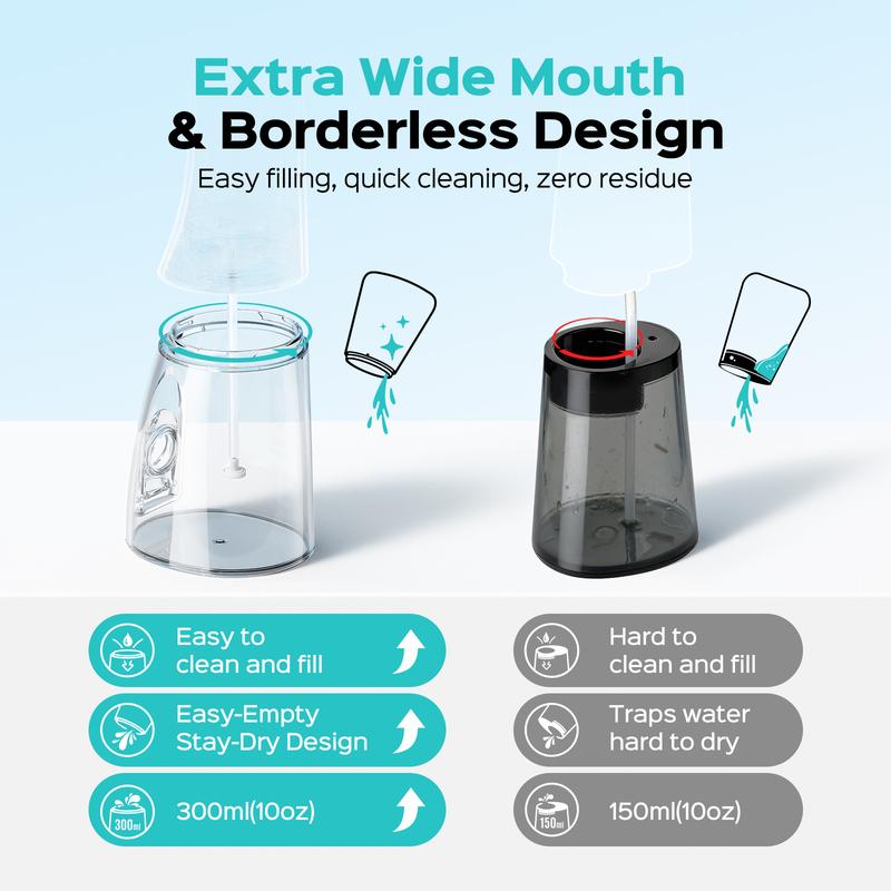 This water flosser is equipped with a 300ml large-capacity tank. A single fill is sufficient for most users' complete cleaning session, eliminating the hassle of frequent refills. Coupled with a thoughtfully designed extra-wide filling opening, the refilling process is more convenient and smoother.