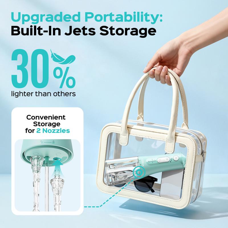 This cordless water flosser features integrated nozzle storage, allowing the tips to be neatly housed within the unit to prevent loss. Its compact and lightweight design makes it easy to handle, whether for business trips, travel, or keeping at the office.