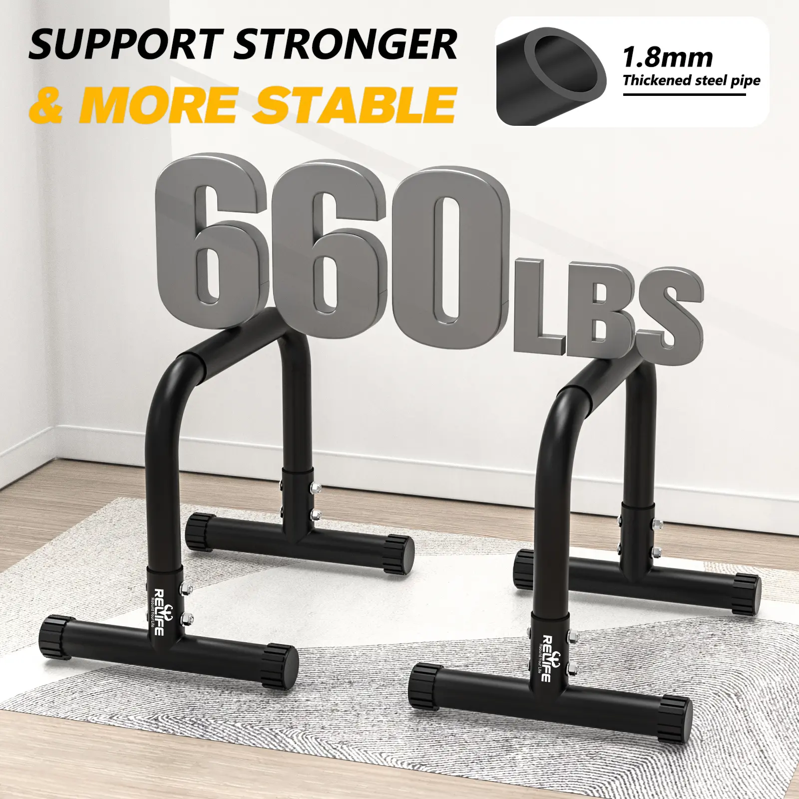 ·【Heavy-Duty & MAX Capacity 660LBS】Push-up bars are made of heavy-duty steel and 1.8mm thickened steel tubing for added durability.The extended base length enhances the stability of the Parallettes Bars and the anti-loosening nuts on both sides add security.High-quality baked-on paint coating prevents flaking and rusting and maintains a smooth finish.