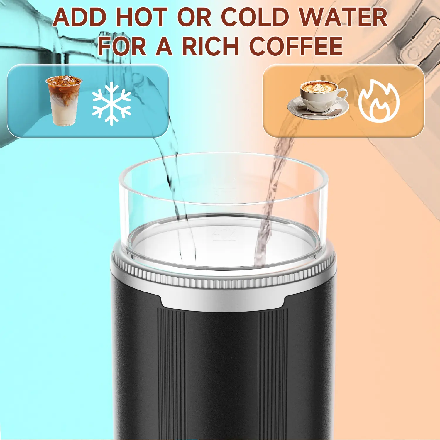 ·This mini travel coffee machine allows you to add hot or cold water, and brew a cup of espresso with just the flip of a button. It's incredibly convenient. 20 bar pressure ensures smooth extraction and rich, crema-rich coffee, comparable to a professional desktop coffee machine!