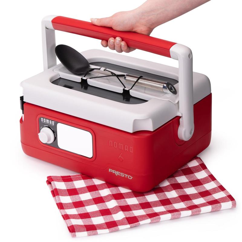 Elevate your on-the-go dining experience with the Presto Nomad Traveling Slow Cooker. This versatile 6-quart slow cooker is designed to accompany you on your culinary journeys, whether you're hosting a tailgate party, attending a potluck, or enjoying a family gathering.Staying organized on the go is a breeze with the Nomad's thoughtful features. Crafted with a unique design, the Nomad features the dry erase board and marker that let you label your dish or jot down a clever message, while the built-in cord storage and removable utensil holder keep everything tidy during transport.Prepare a variety of mouthwatering meals with ease, from hearty soups and stews to tender pulled pork and juicy chicken wings. Even less expensive cuts of meat will tenderize as they cook, transforming them into flavorful, fall-off-the-bone delights. The 6-quart capacity allows you to feed a group, making this slow cooker perfect for buffet-style servings.Enjoy the convenience of customizable cooking with the Nomad's slow cook settings for high, low, and keep warm. The large see-through glass window in the cover allows you to monitor the progress of your dish without lifting the lid and disrupting the cooking process. And cleanup is a breeze, too. The removable porcelain enameled cooking pot is fully immersible and removable, ensuring easy maintenance.Whether you're preparing a family-sized meal at home or catering to a crowd on the road, the Presto Nomad Traveling Slow Cooker is your reliable companion for delicious, effortless culinary adventures. Embrace the convenience and versatility of this exceptional slow cooker and elevate your on-the-go dining experience.