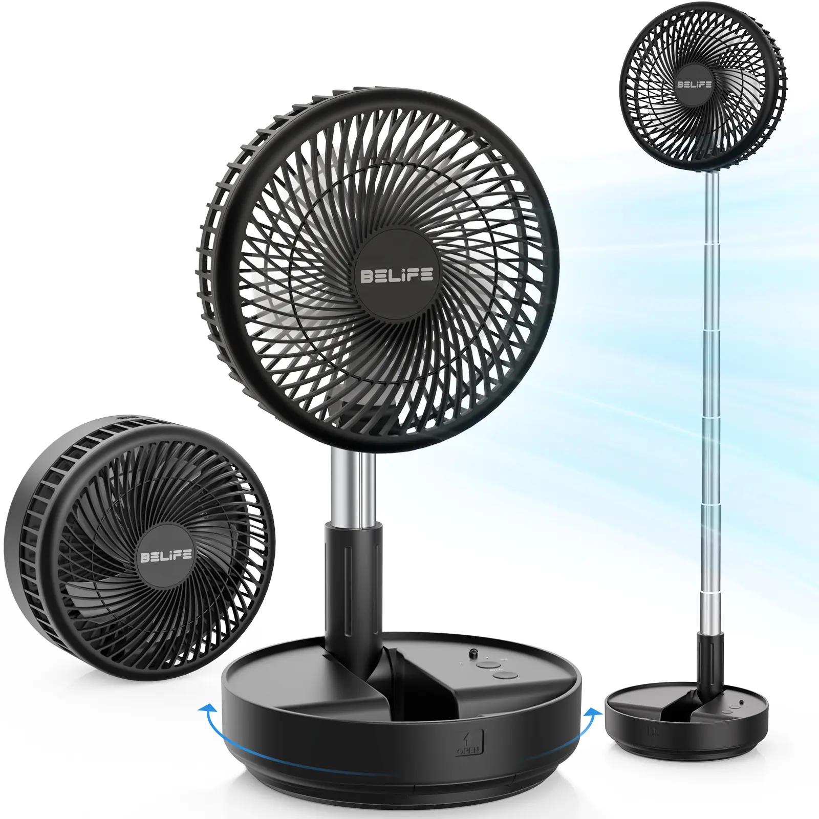 This fan is very powerful for such a small fan, it has 3 setting low, mid, high and oscillating. I sit mine at the bottom of my bed, to only blow cool air on me, so not to freeze the husband. You can easily travel with this fan, also has a remote control and charges by USB charging which I love!