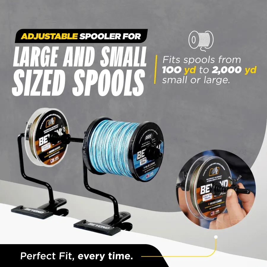 FITS MOST SIZE SPOOLS- Will fit almost every type of fishing line spool from small to large. Ideal for spooling up with 100yd, 150yd, 300yd, 500yd, size spools, but will fit some large spools up to 2000yds.