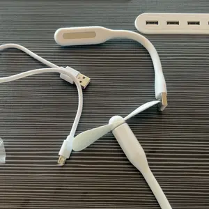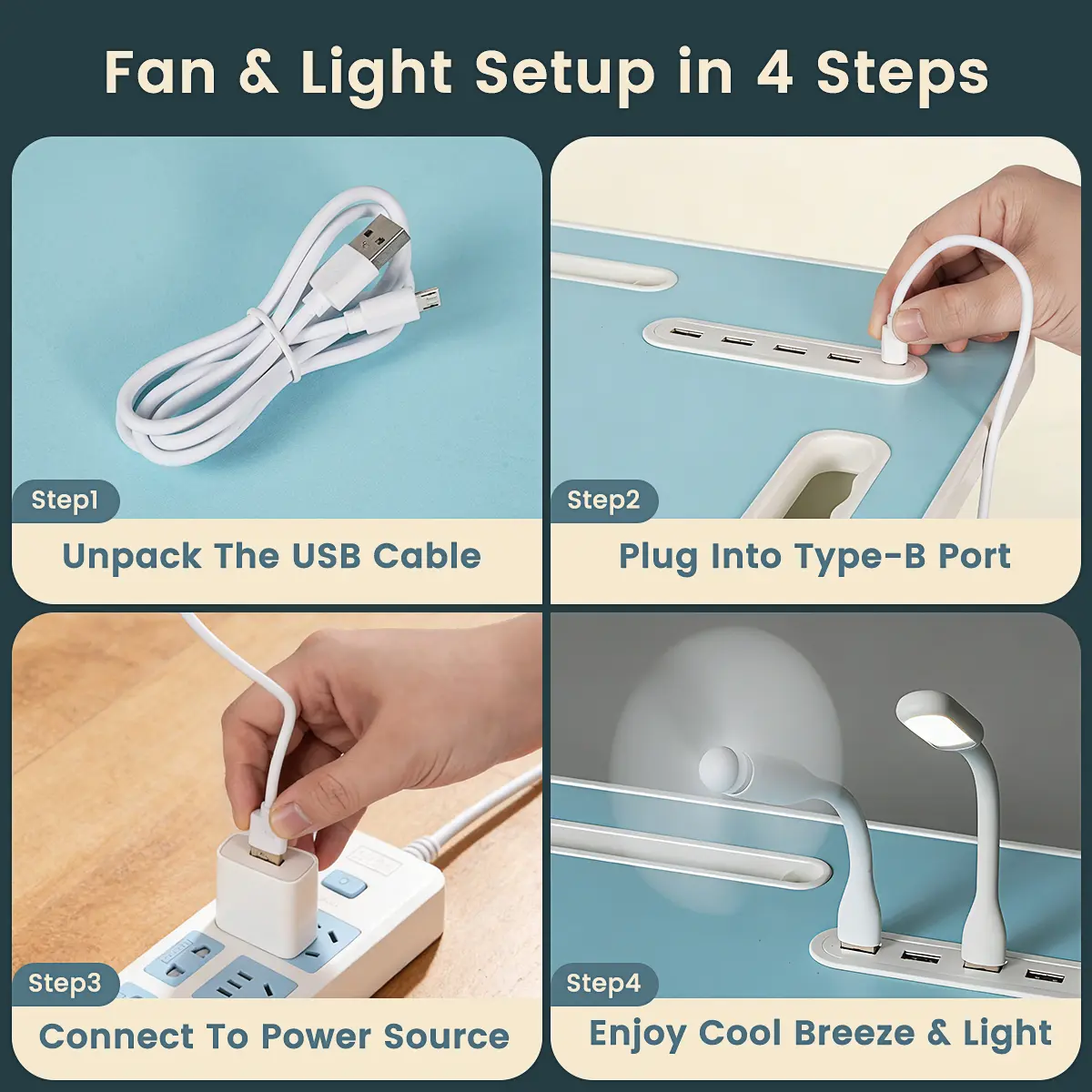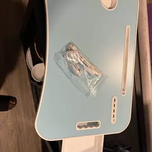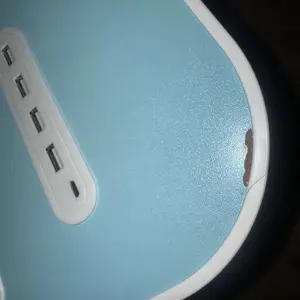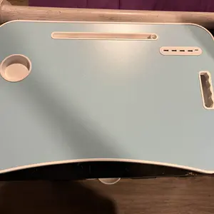 ·Easily carry this portable laptop table indoors and outdoors. The middle tray features a slot for phones, tablets, and books. The left slot has 4 USB ports for charging mobile devices simultaneously. Includes a small USB fan and lamp.