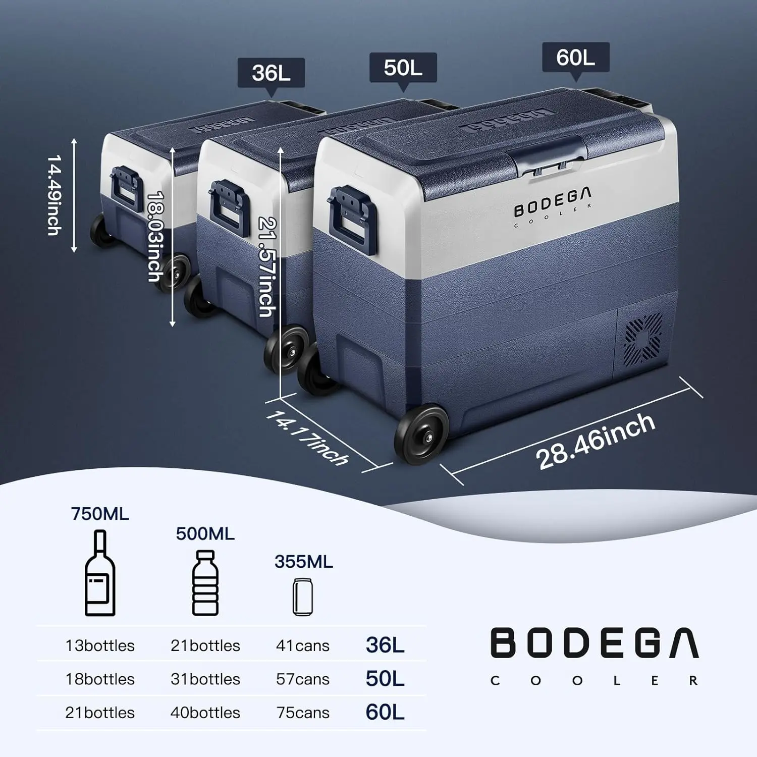 ·DUAL ZONE WIFI APP CONTROL CAR FRIDGE:BODEGACOOLER 12Volt refrigerator is equipped with two zone,the two zones can be independently controlled for temperature.Left zone 28.5L(30 Quart)+right zone 21.5L(23 Quart)=50L(53 Quart),If you want only one zone,you can take off the middle plate.This powerful rv fridge can hold 57cans,or 31 bottles water or 18 bottles red wine.Our car refrigerator support WIFI connection, App control.(For android and ios)