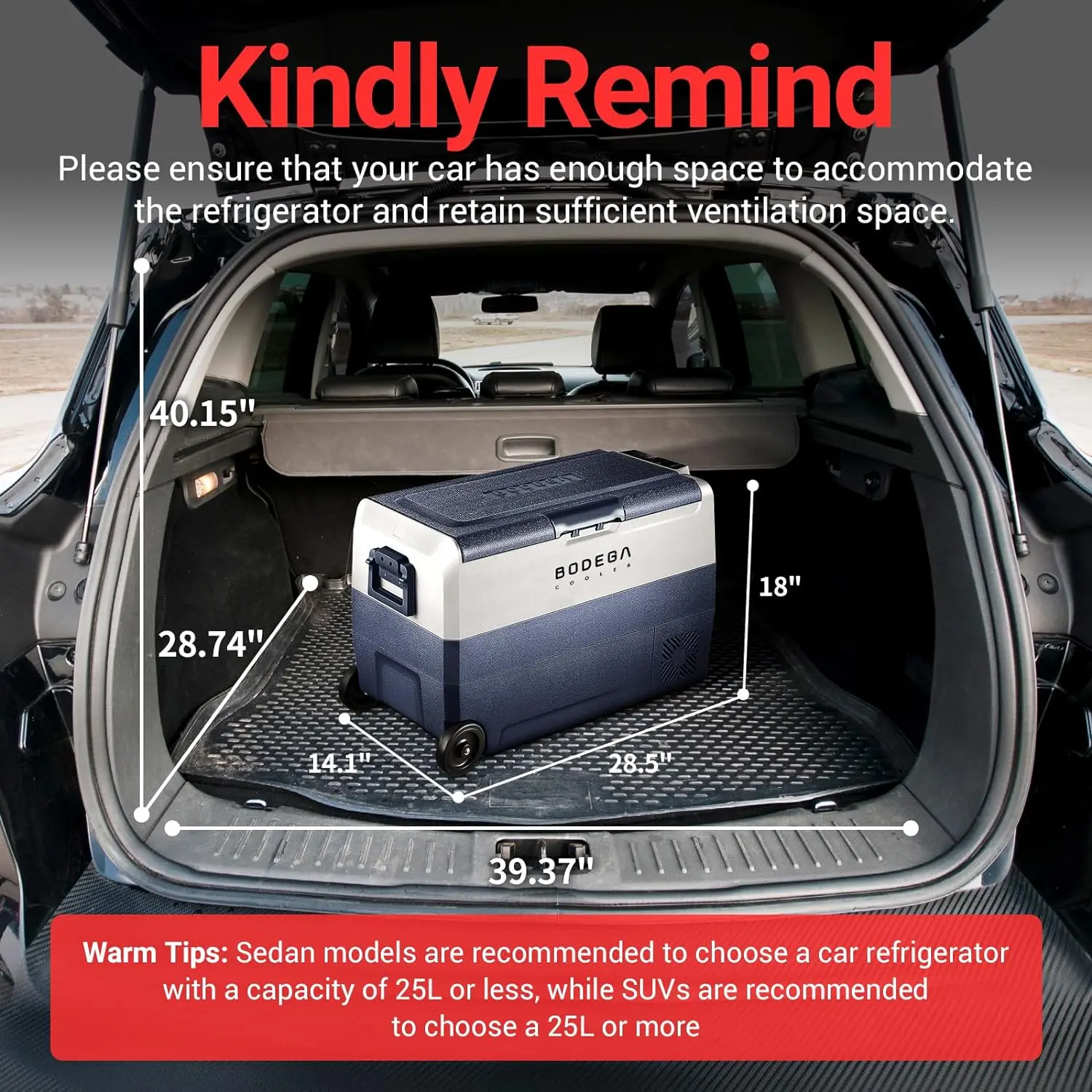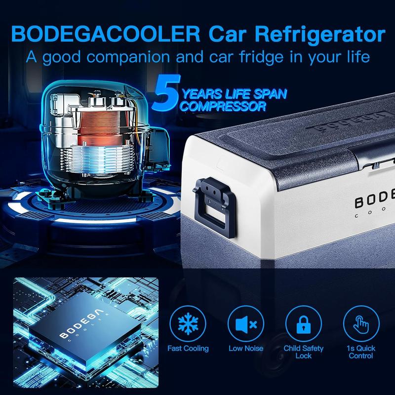 ·ANTI-SHAKING: BODEGACOOLER 12v fridge provides a silent and comfortable environment for you.Because of its overall external smooth lines and equipped with a multi-functional non-slip base, the lateral displacement is greatly reduced. When your car is climbing at an inclination angle of 30 degrees, the car portable freezer can still run stably.Our portable car refrigerator allows you to enjoy cold drinks in stable and quiet during the trip