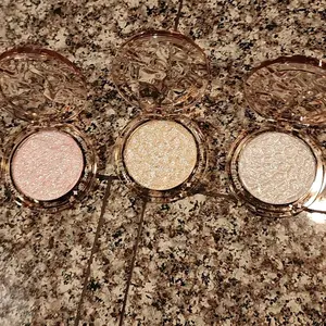 I just got these today. They are so pretty. I cannot wait to wear some over my blush or on the side of my eye. The case is really cute also , shipping was awesome. There is a light pink a light gold and white light shiny. Love it 😊