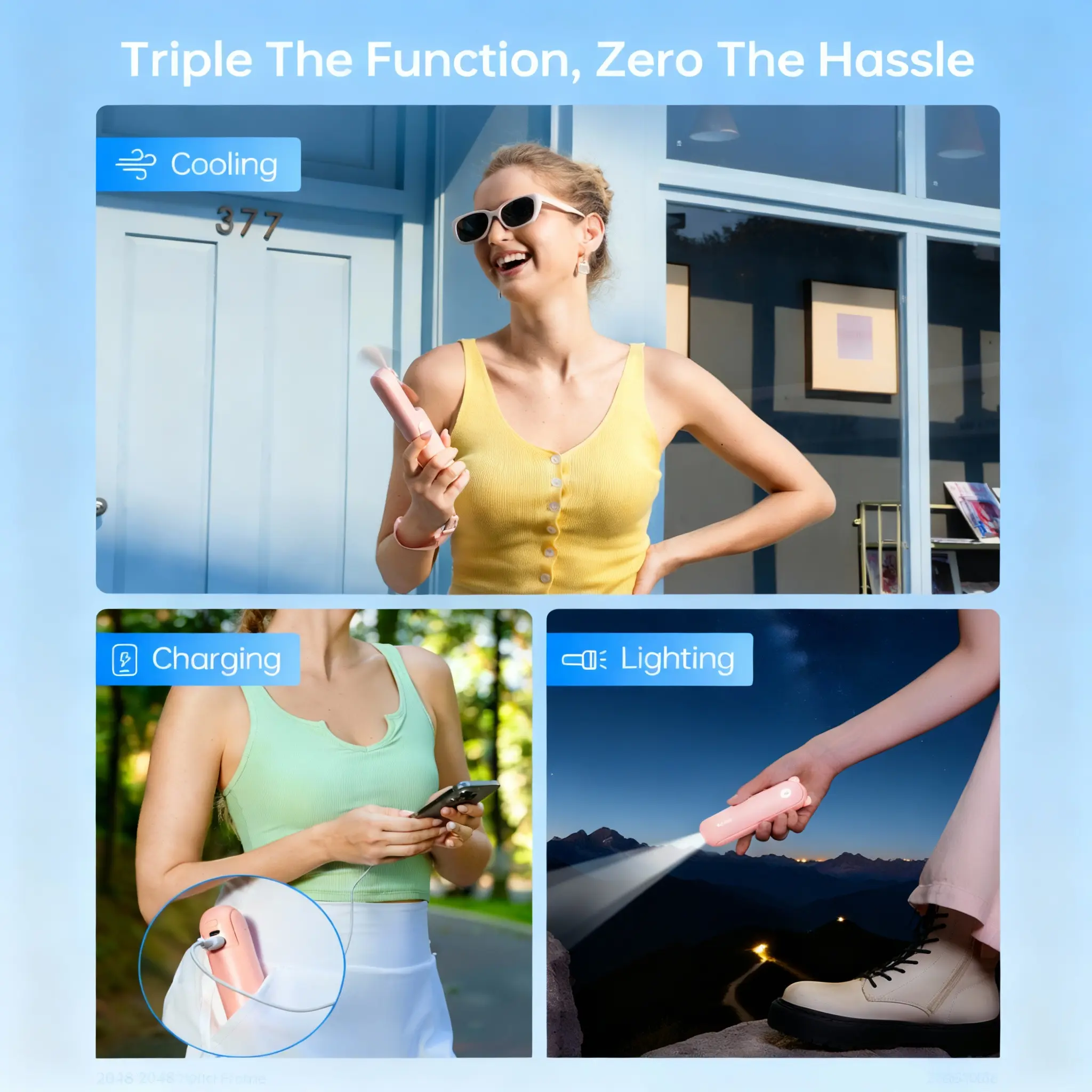 🌟 3-in-1 Multifunctional Portable Fan 🌟- USB Power Bank & Flashlight included- Compact & Versatile design for on-the-go cooling