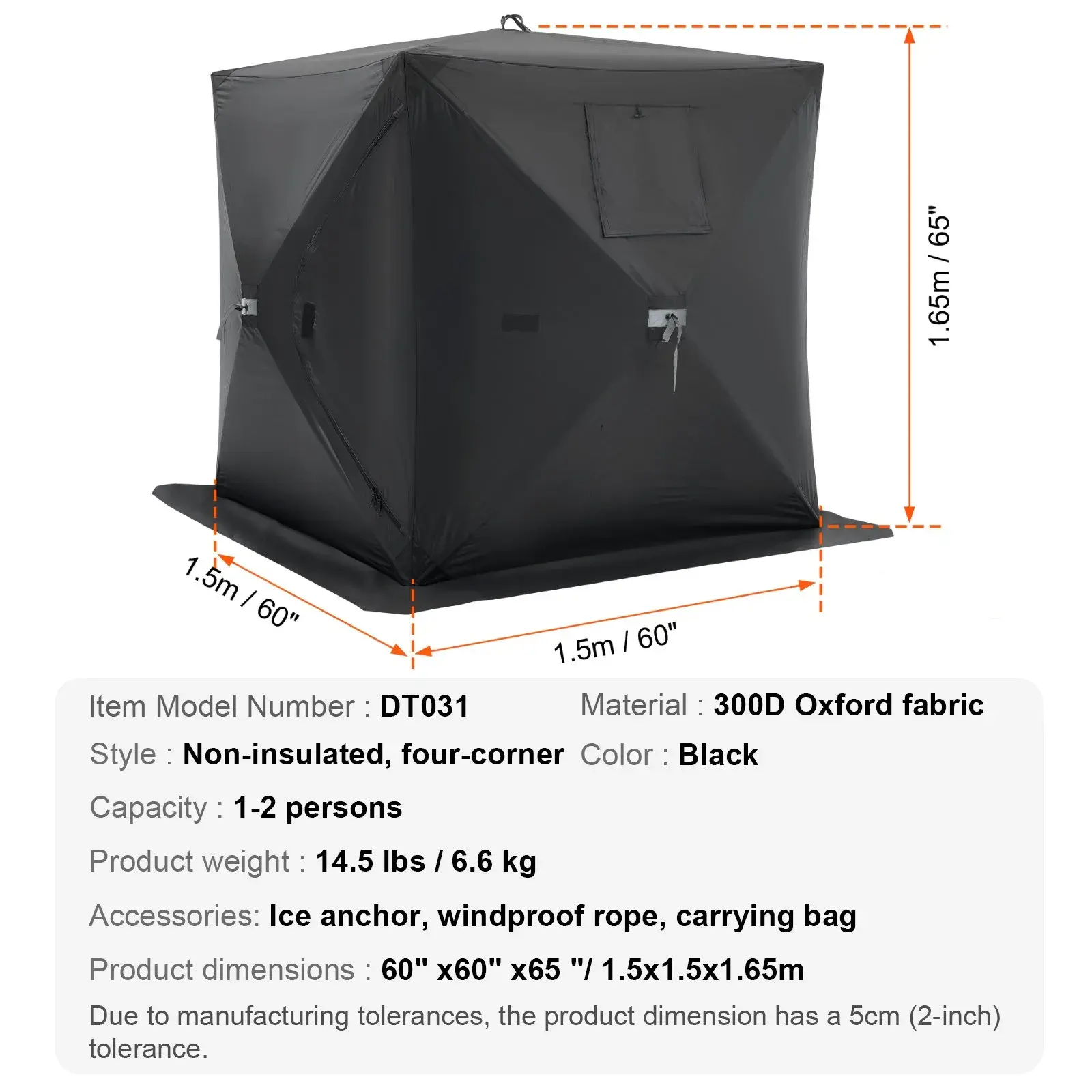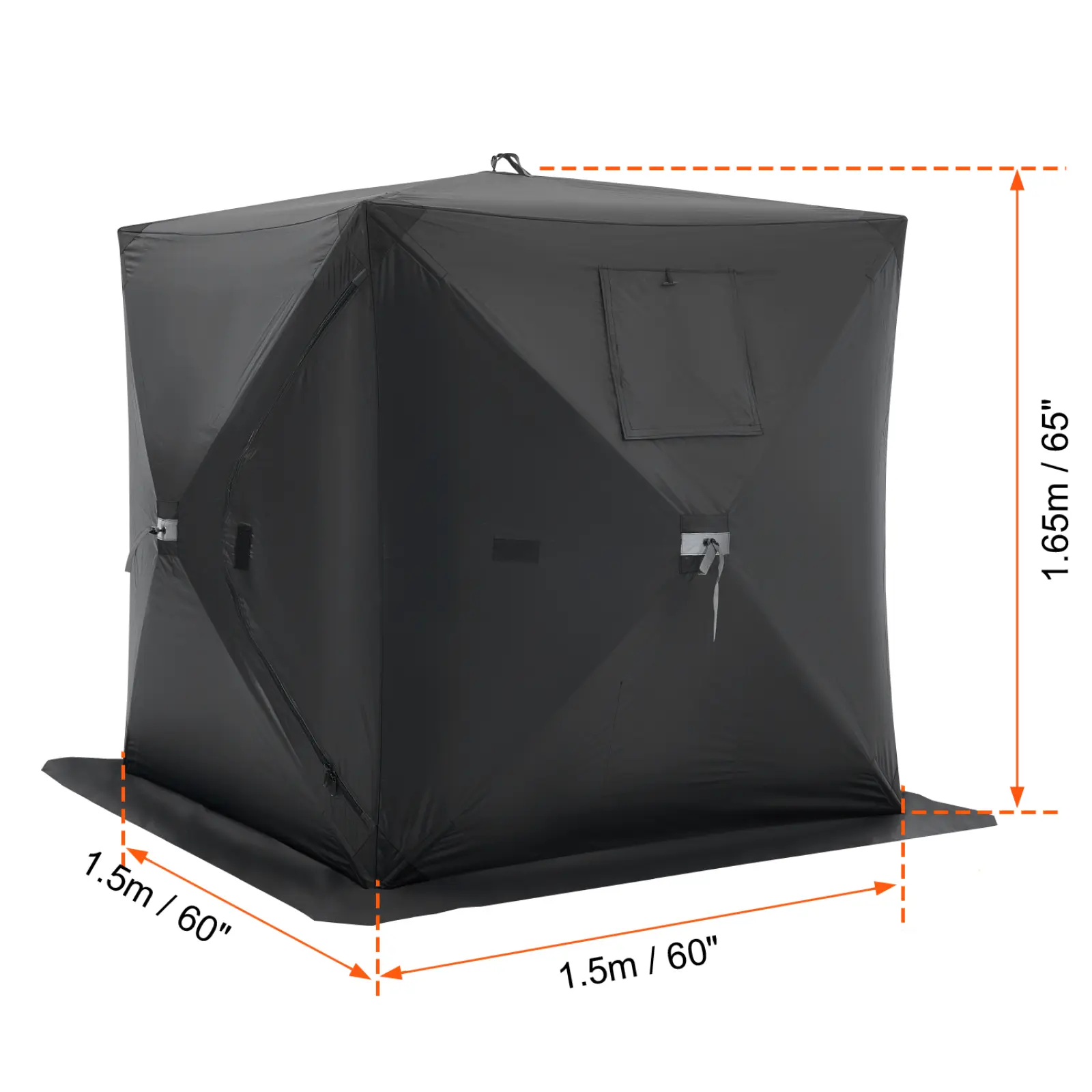 • Additional Details: This 60x60x65 inch ice fishing shanty with carrying bag features a removable window design for adjustable ventilation and reduced leak risk. The zipper door design allows for easy entry and exit. An internal storage bag provides convenient organization for various items, enhancing your comfort and enjoyment during winter fishing.