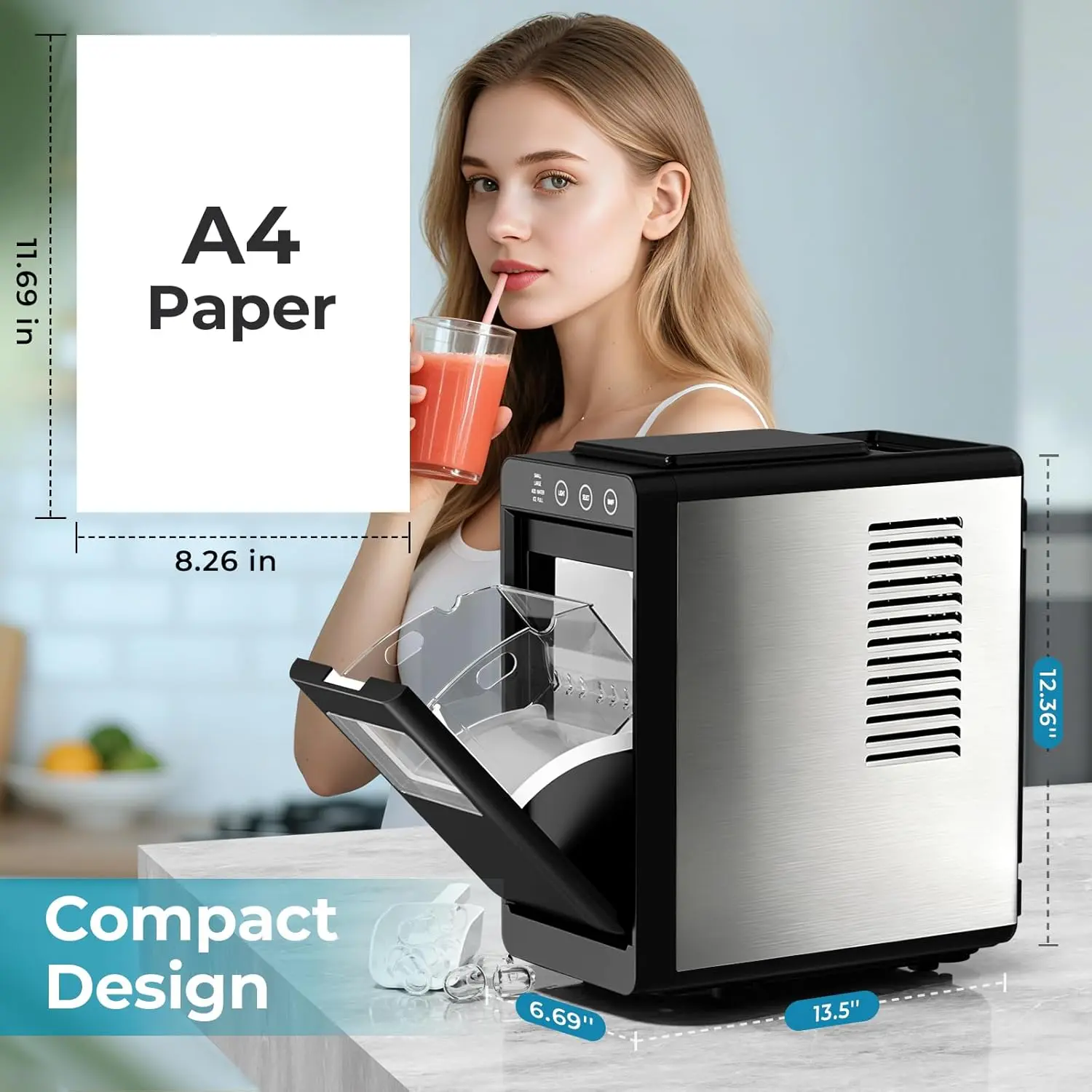 ·Select Your Perfect Ice Size & Texture:Tailor your ice to any occasion. Choose between two sizes (Small or Large) to perfectly suit your drinks, from cocktails to iced coffee. This flexibility makes it a versatile countertop ice maker for all your needs.