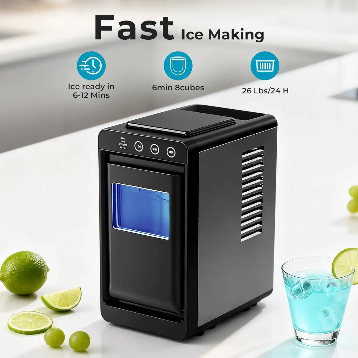 ·Quick & Quiet Ice Production with Blue Ambient Light:This compact ice maker produces 8 bullet ice cubes in just 6-12 minutes (26.5 lbs/day). It operates quietly and features a 1.8L visible water window. The sleek blue lighting effect adds a modern touch to your kitchen, office, or bar while providing clear operational status.