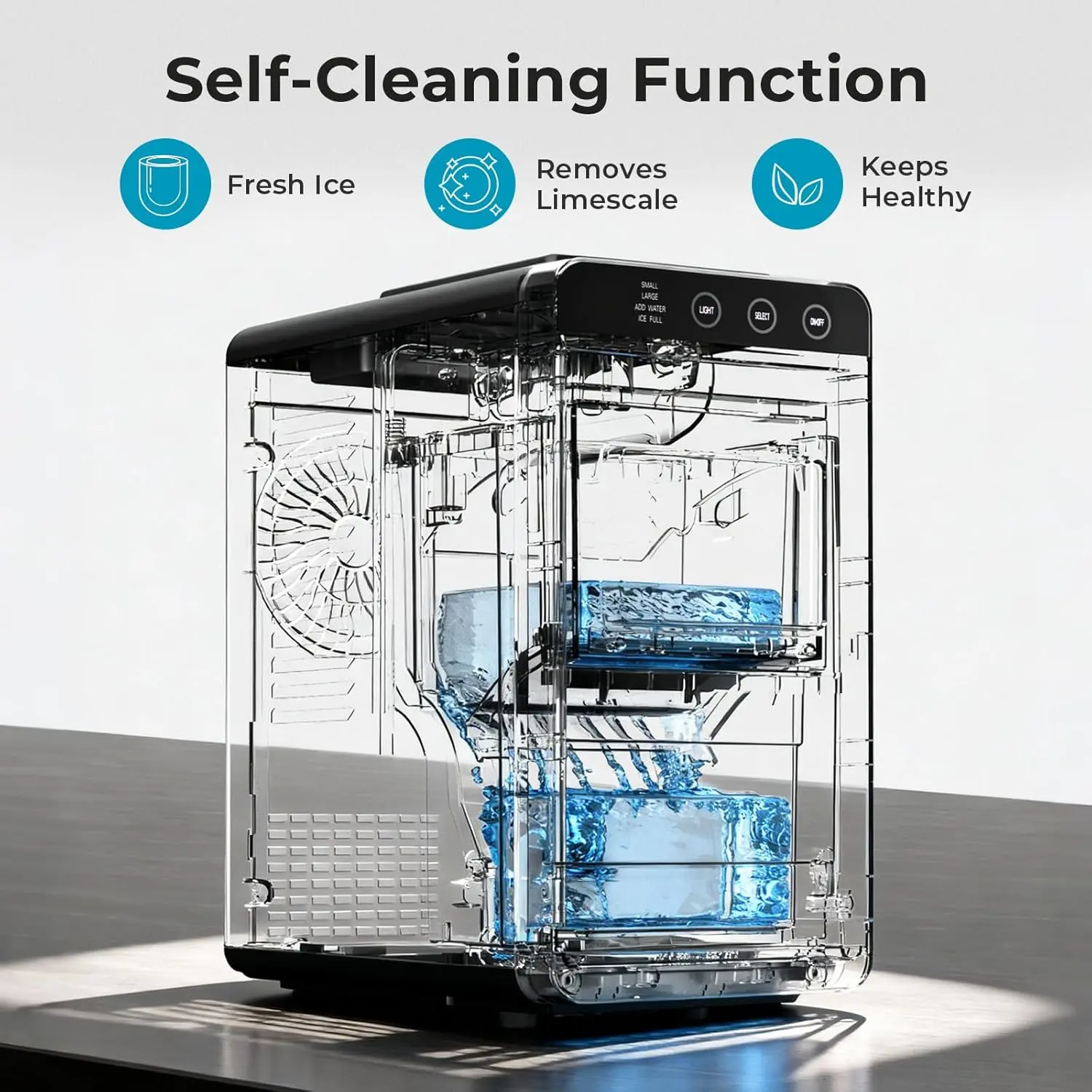 ·One-Touch Self-Cleaning for Effortless Maintenance:Keep your ice pure and fresh with the smart self-cleaning function. This ice machine uses an automated cycle to eliminate mineral buildup, ensuring hygienic ice production with minimal effort, making it ideal for long-term use.